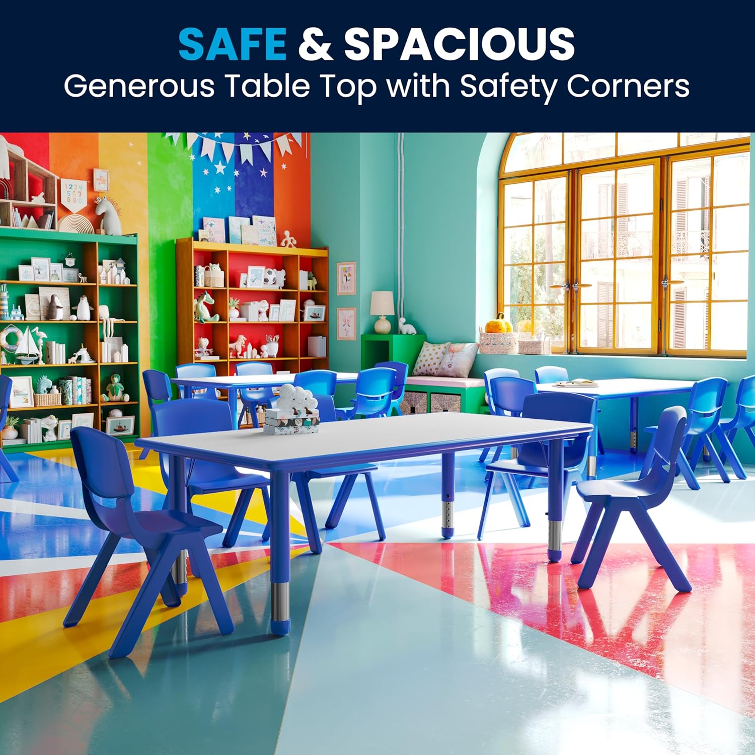 - SEATS UP TO 6 CHILDREN: Comfortably seats up to 6 children with plenty of room between each child and can be paired with 6 vibrant stackable school chairs with a height size of 6.5" to 14"