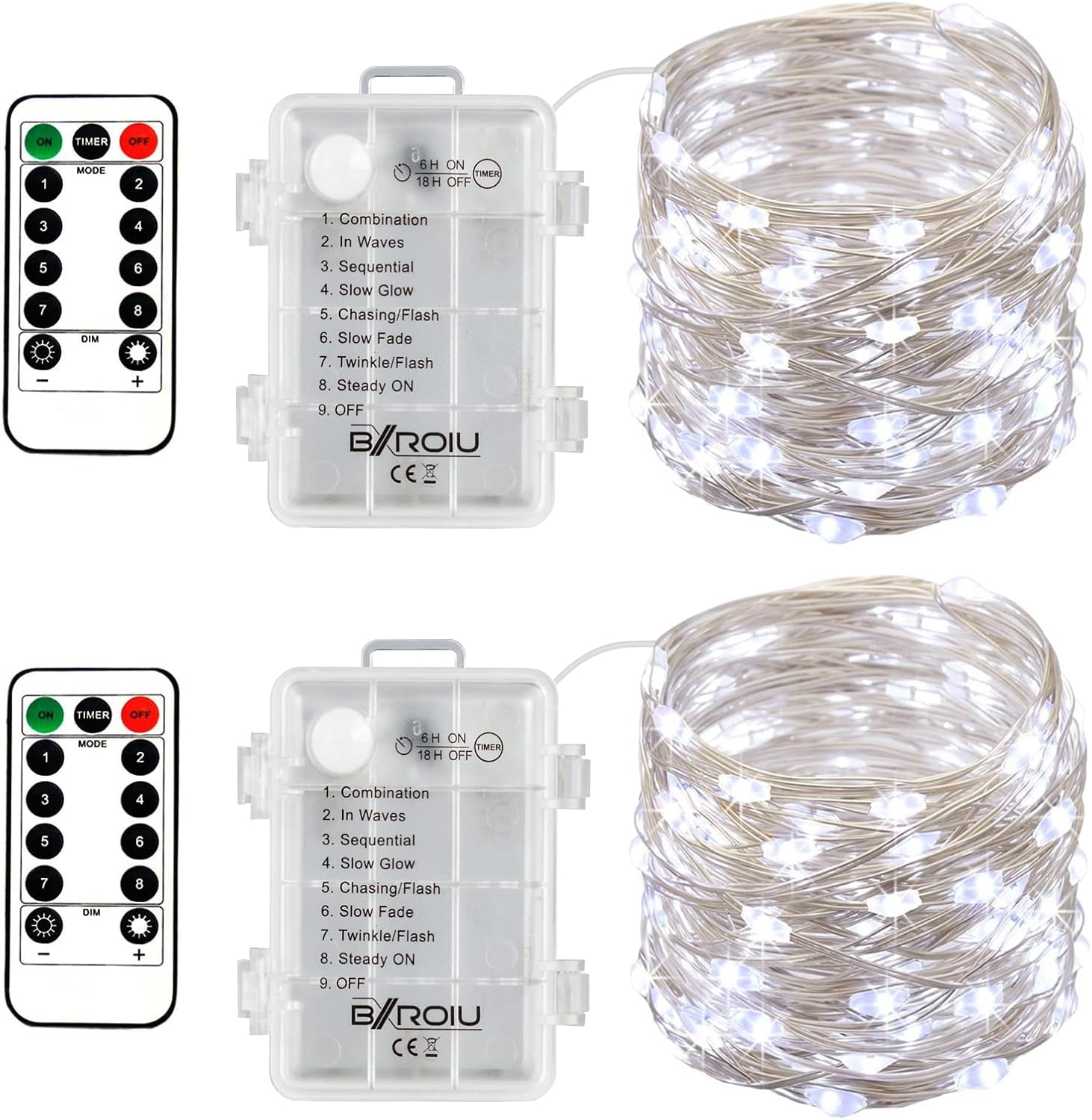 2 x Fairy Lights Battery Operated,Silver Wire Chains 8 Mode 16Ft/5Meter 50 LEDs Timer String Lights with Remote Control for Bedroom Christmas Party Wedding Decoration (Cool White)