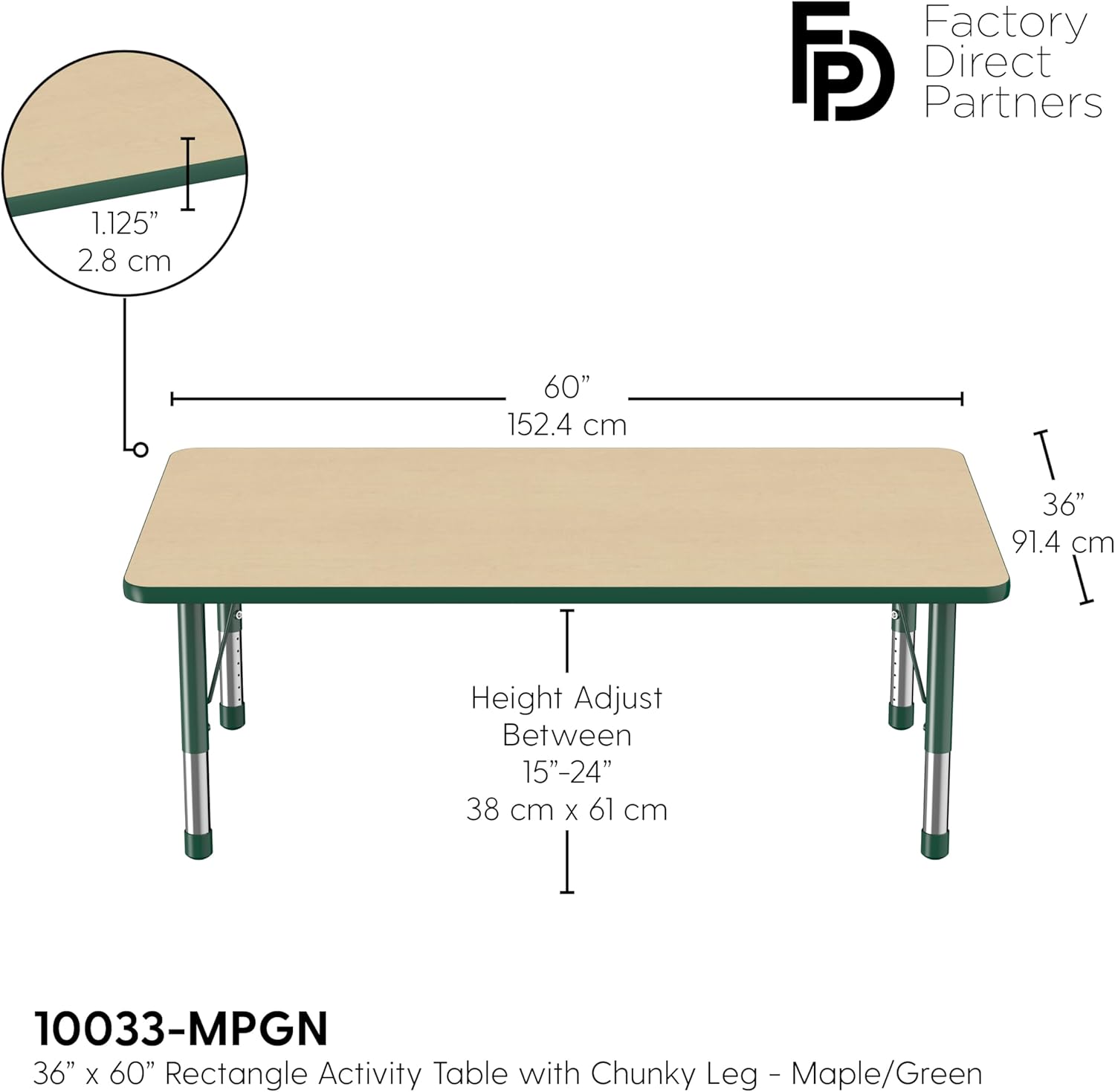 Factory Direct Partners FDP Rectangle Activity School and Classroom Kids Table (36 x 60 inch), Toddler Leg, Adjustable Height 15-24 inches - Maple Top and Green Edge
