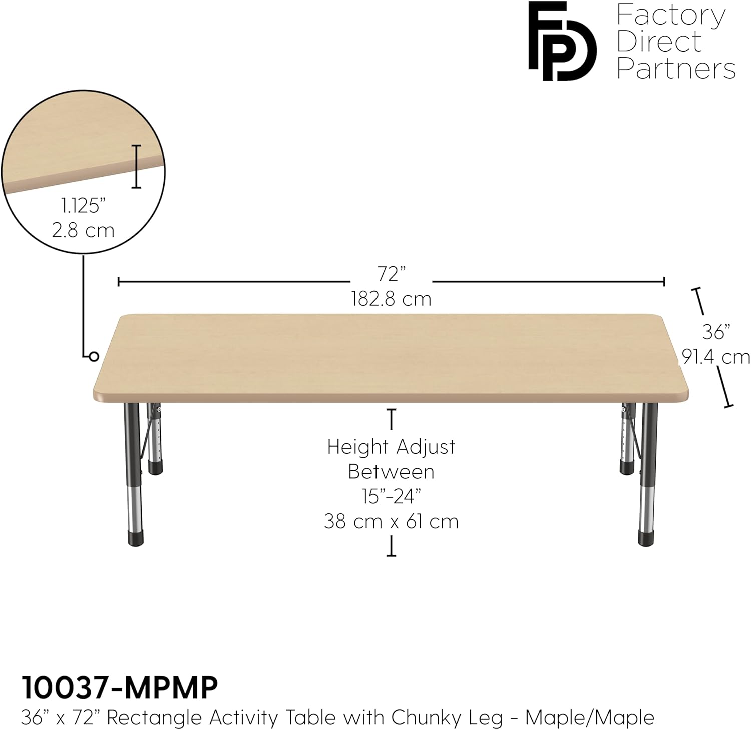 FDP Rectangle Activity School and Classroom Kids Table (36 x 72 inch), Toddler Legs, Adjustable Height 15-24 inches - Maple Top and Maple Edge