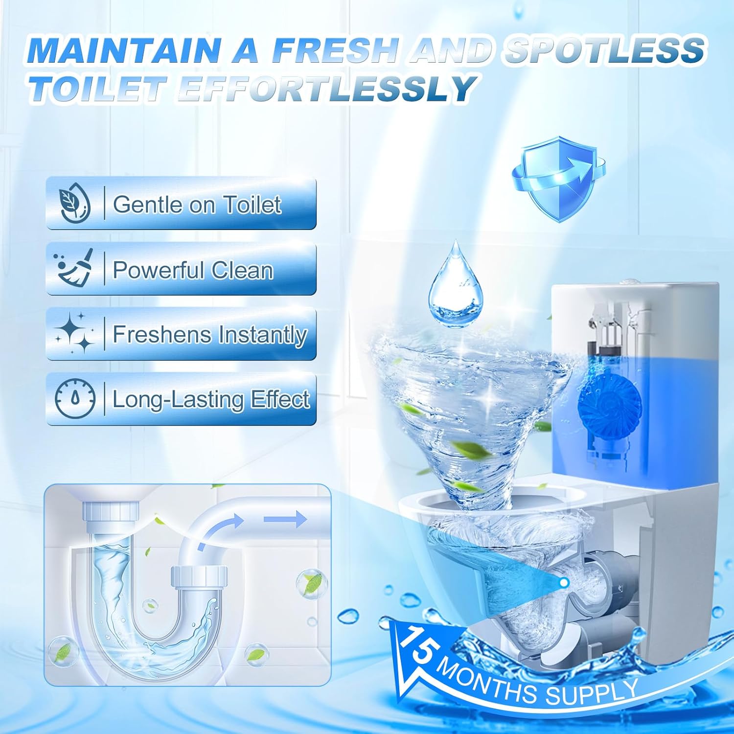 - LONG-LASTING DESIGN: Designed with a slow release technique,each toilet tablet can continuously clean the toilet for up to 15 days with 20 flushes a day at room temperature(25゜).Water quality and the number of flushes in a day determine the exact days. Please note:each toilet tablet's lifetime may vary