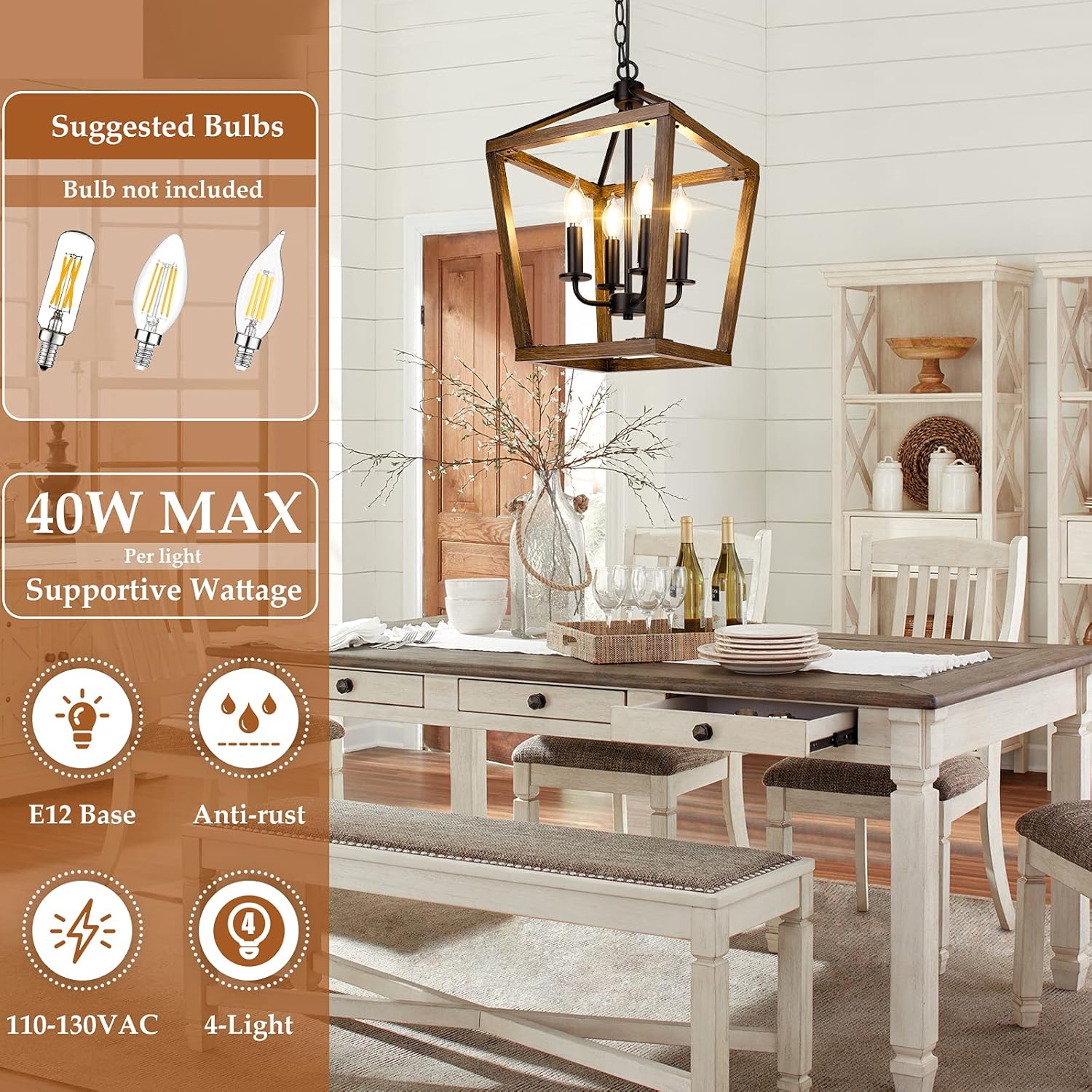 - 【Bulb Requirement】The hanging chandelier has 4 E12 base sockets and does not include light bulb. You can choose Edison bulbs as showed on images or other types you like to match it. Light bulbs with dimming capacity also work on this light fixture so you can easily change the mood of your space. The maximum bulb wattage is 40 Watt for each light