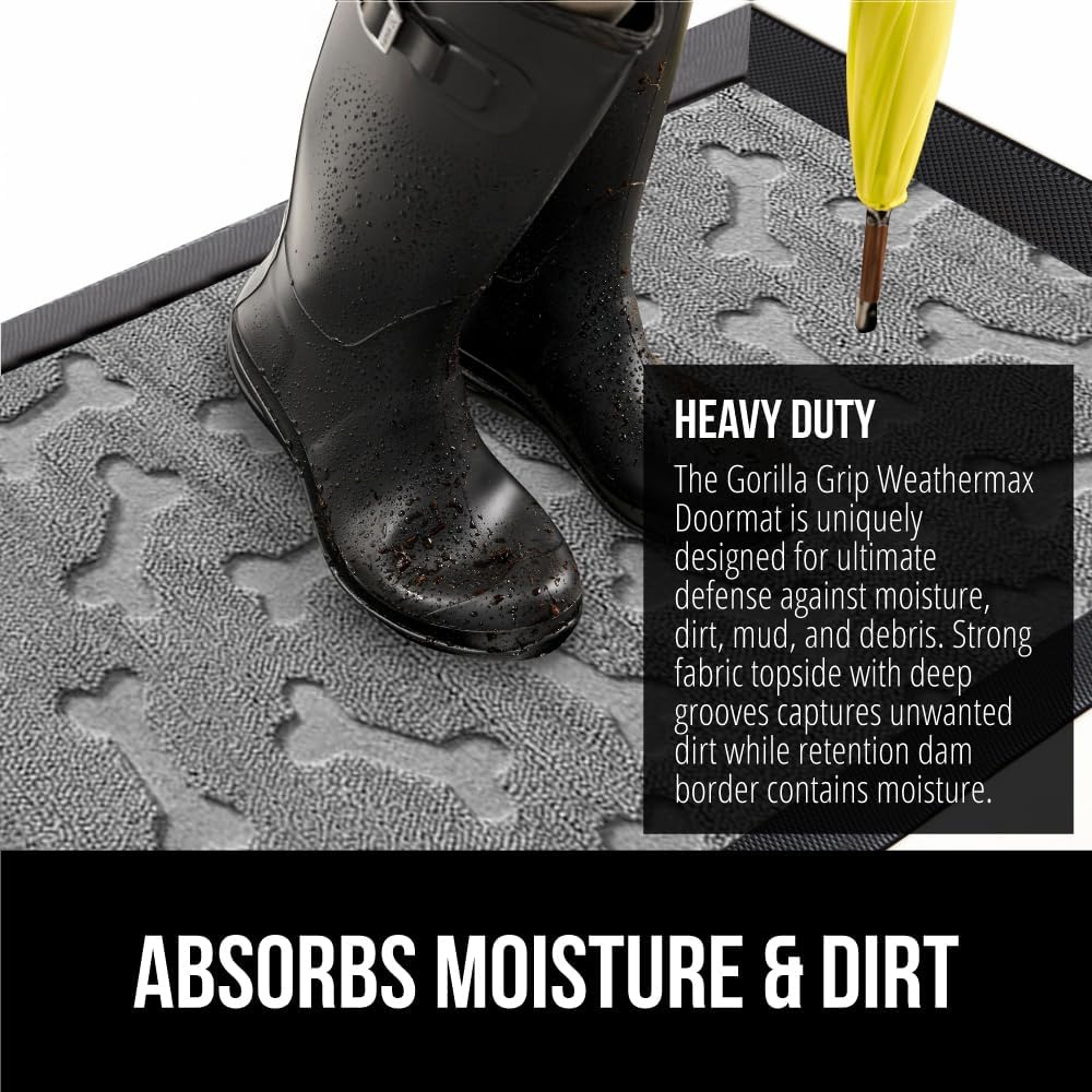 GORILLA GRIP 100% Waterproof All-Season WeatherMax Doormat, US Designed Natural Rubber, Stain and Fade Resistant, Low Profile Indoor Outdoor Door Mats, Easy Clean Patio Mat, 17x29, Light Gray Bones