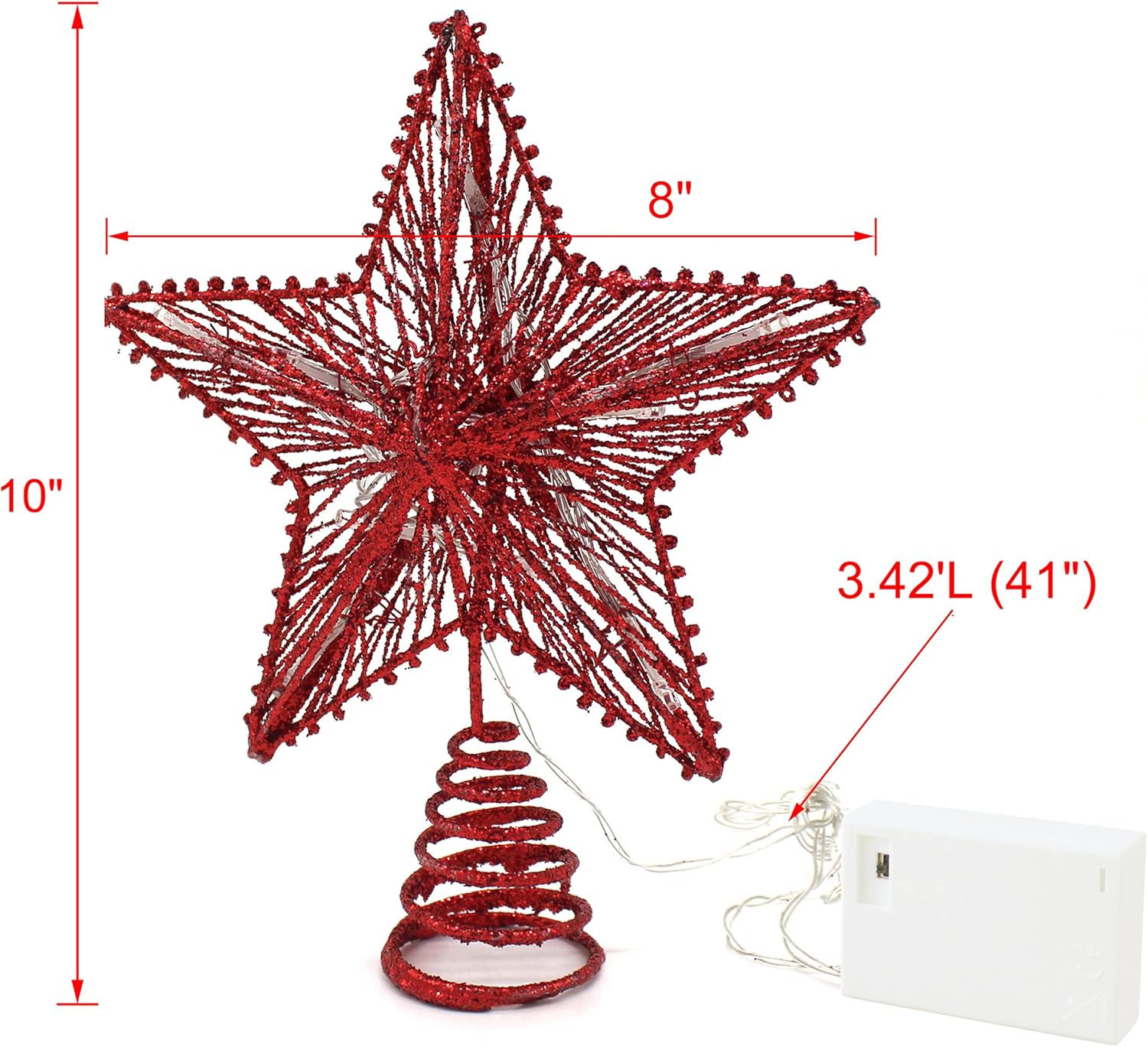CVHOMEDECO. Red Glittered 3D Tree Top Star with Warm White LED Lights and Timer for Christmas Tree Decoration and Holiday Seasonal Décor, 8 x 10 Inch