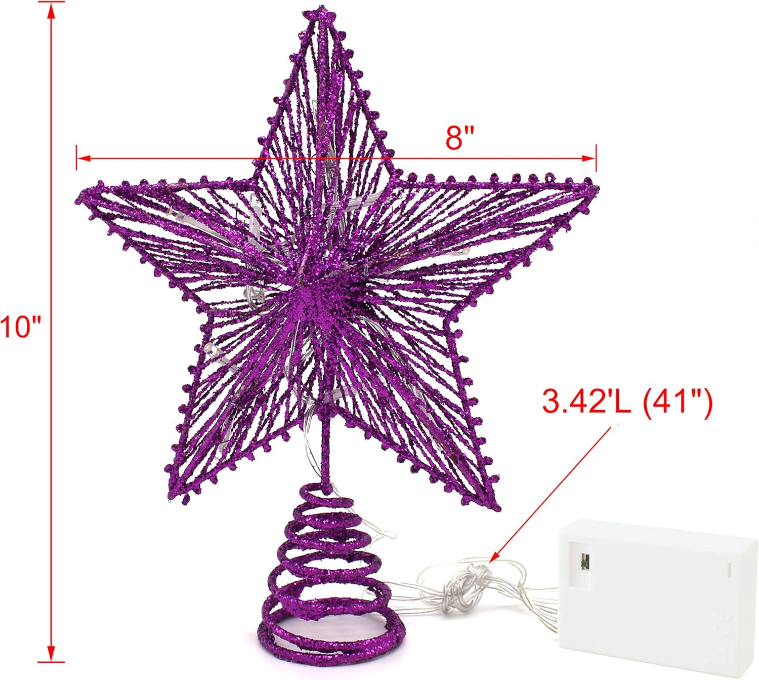 CVHOMEDECO. Violet Glittered 3D Tree Top Star with Warm White LED Lights and Timer for Christmas Tree Decoration and Holiday Seasonal Décor, 8 x 10 Inch