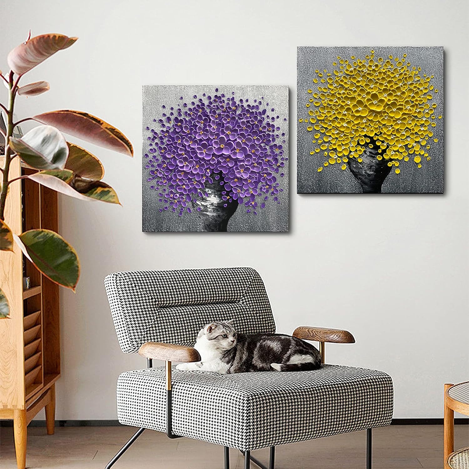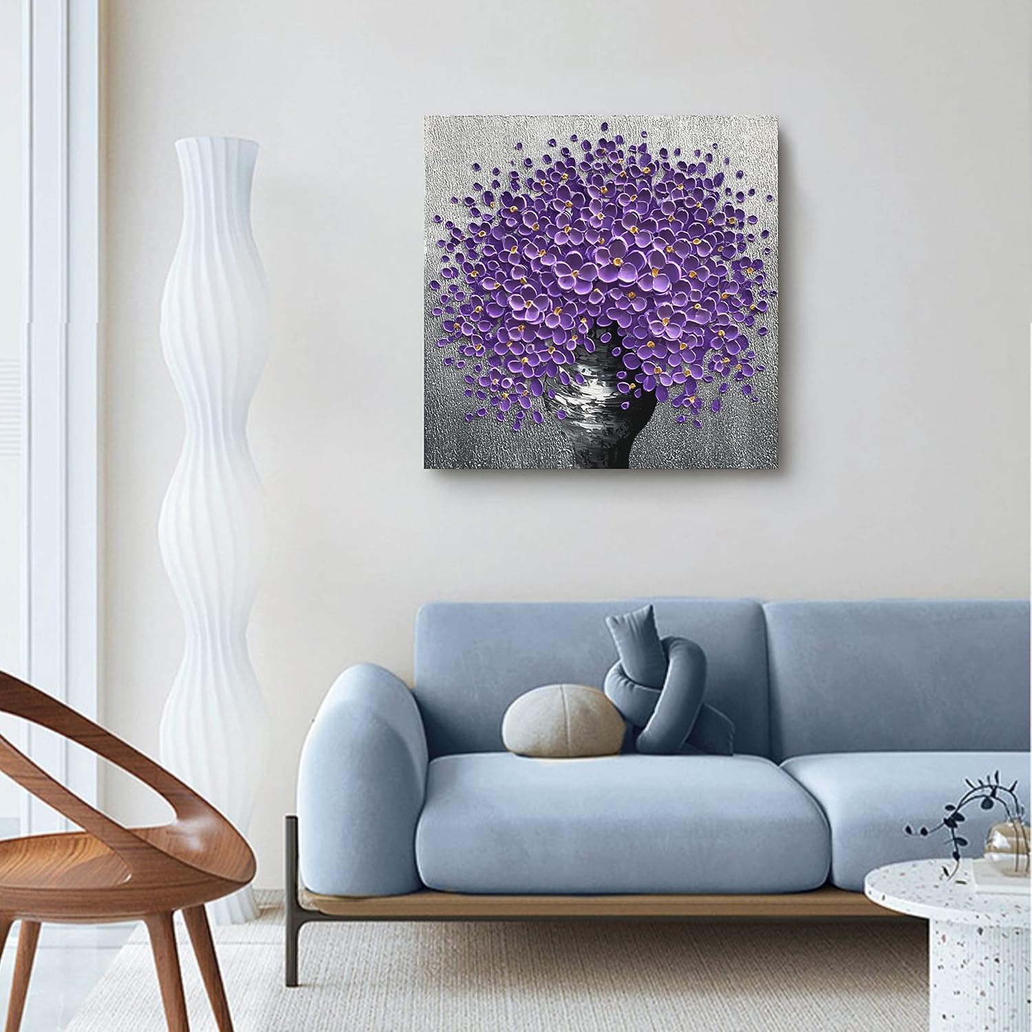 24x24 Hand-Painted Purple Flowers 3D Abstract Decorative Paintings, Wall Decorative Frame Wall Art, Modern Art Living Room Bedroom Office Hotel and Restaurant Wall Art