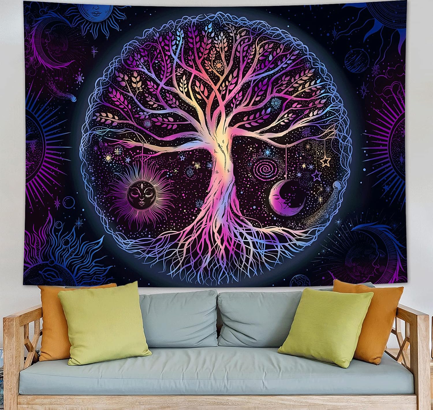 - 【Beautiful Life Tree Tapestry】Our tree of life tapestry represents a vibrant pattern of a large tree with spreading branches and roots reaching up in the galaxy and it is contained within an aperture, which is surrounded by sun and moon as well as the dazzling constellations. The whole picture looks natural and harmonious.