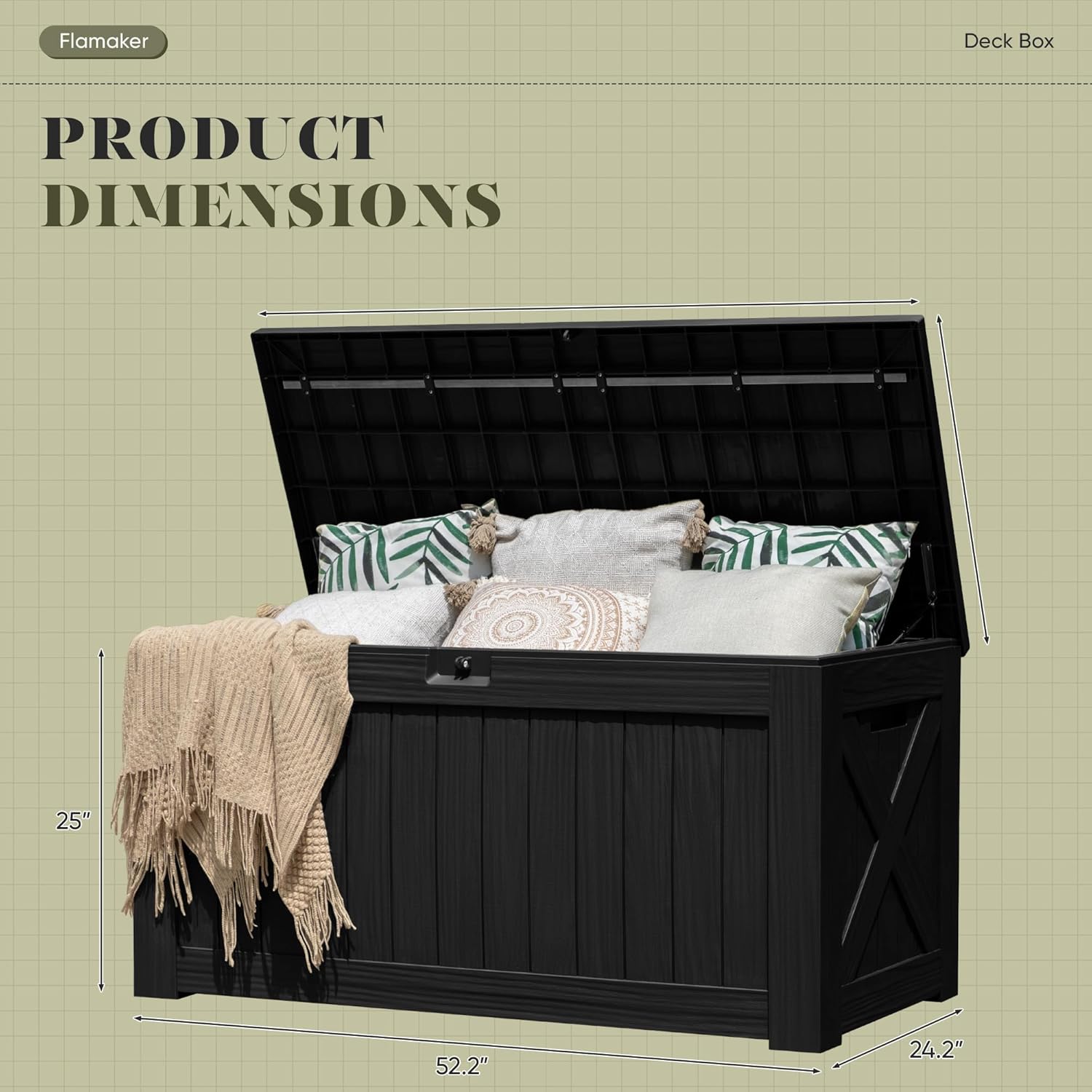Flamaker Resin Deck Box 120 Gallon Waterproof Large Outdoor Indoor Storage Box Imitation Wood Resin for Patio Furniture Garden Tools and Pool (Black)