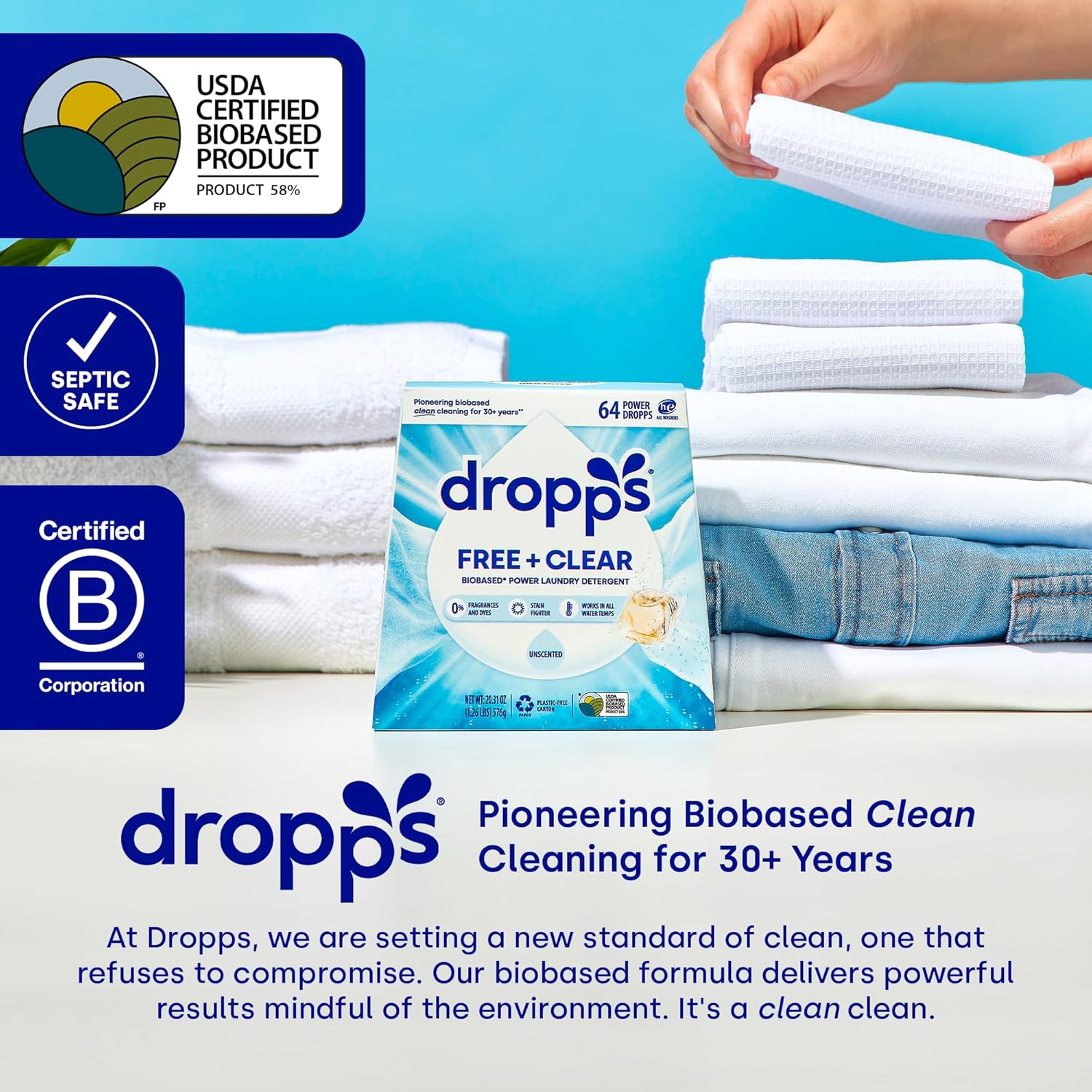 - EFFORTLESS CLEANING POWER: Get your laundry exceptionally clean with Dropps Free + Clear Laundry Detergent Pods. These Power Dropps are specially formulated to lift away stubborn stains and neutralize odors effectively, providing a thorough clean with each wash. Compatible with all washers (HE + standard), wash cycles, and temperatures. Unscented. 64 Power Dropps.