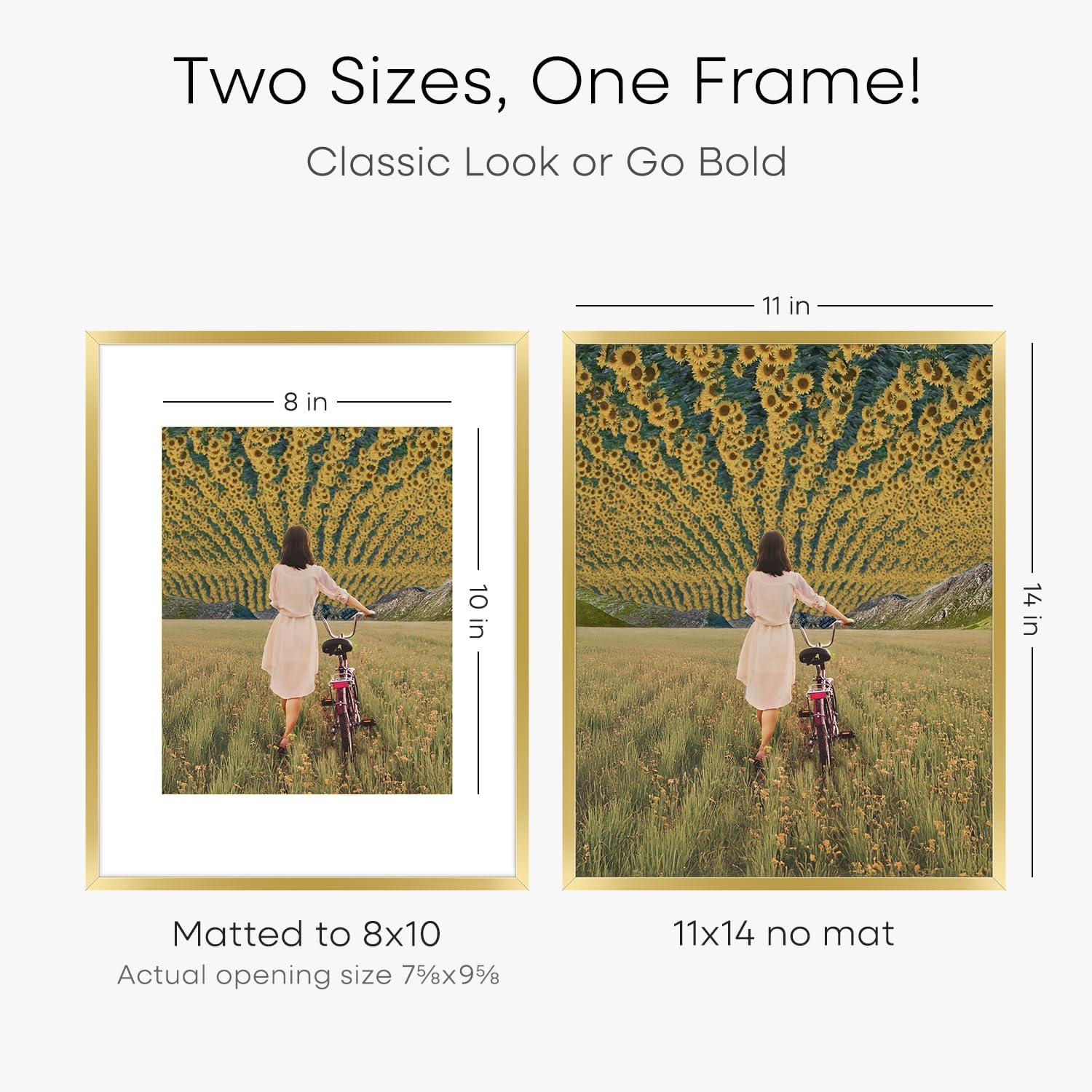 Homeforia 11x14 Picture Frame Gold, High End Metal 11x14 Poster Frames with Mat for 8x10, 11 x 14 Gold Frame Matted to 8 x 10 inch Photo, 11by14 Thin Hanging Frames, Tempered Glass, Wall Kit, Set of 1