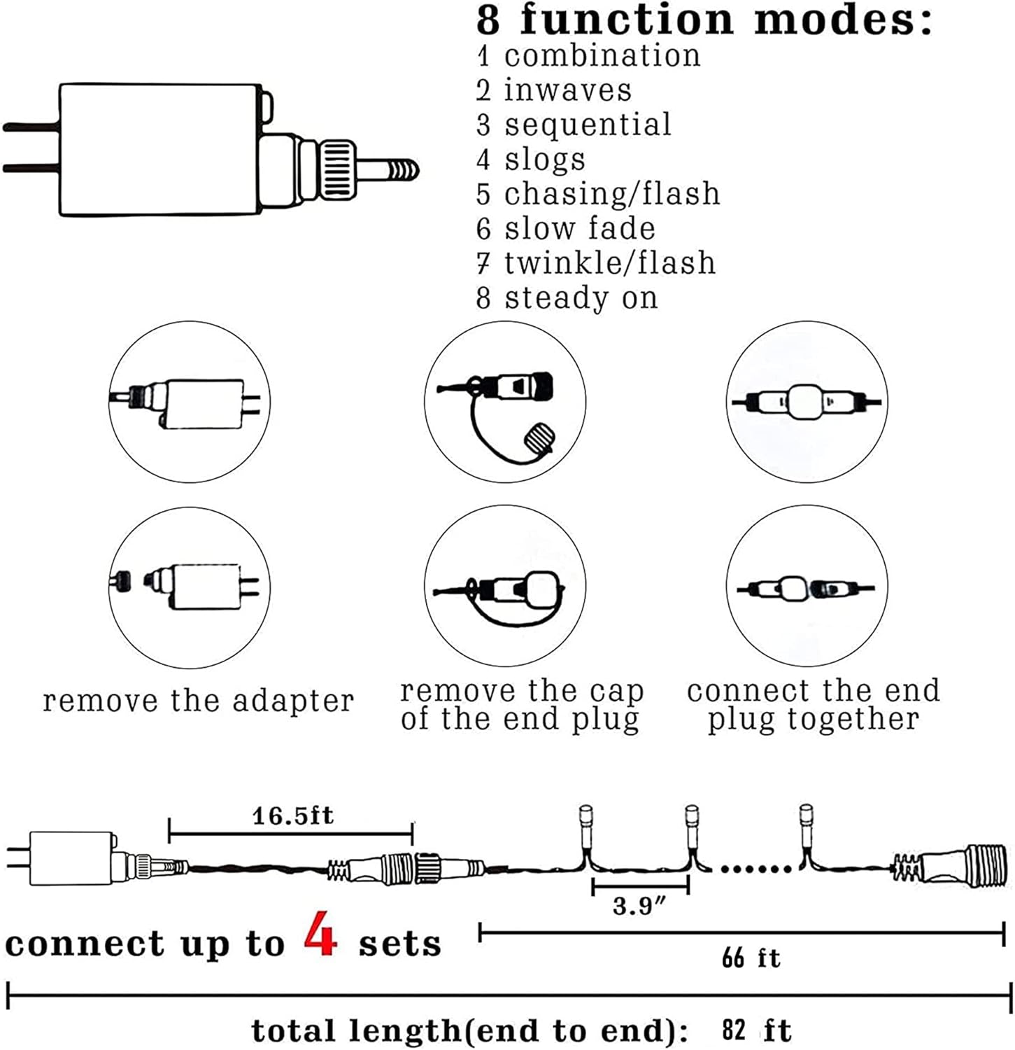 - Christmas Decorations String Lights: 66 ft string lights with 200 individual LED bulbs, the lead wire is 16.5 feet, total length is 82.5 ft, and the bulb spacing is 3.9 inches. Each string lights has end-to-end connection, you can connect up to 4 sets together to illuminate a wider range, available for different decorative use.