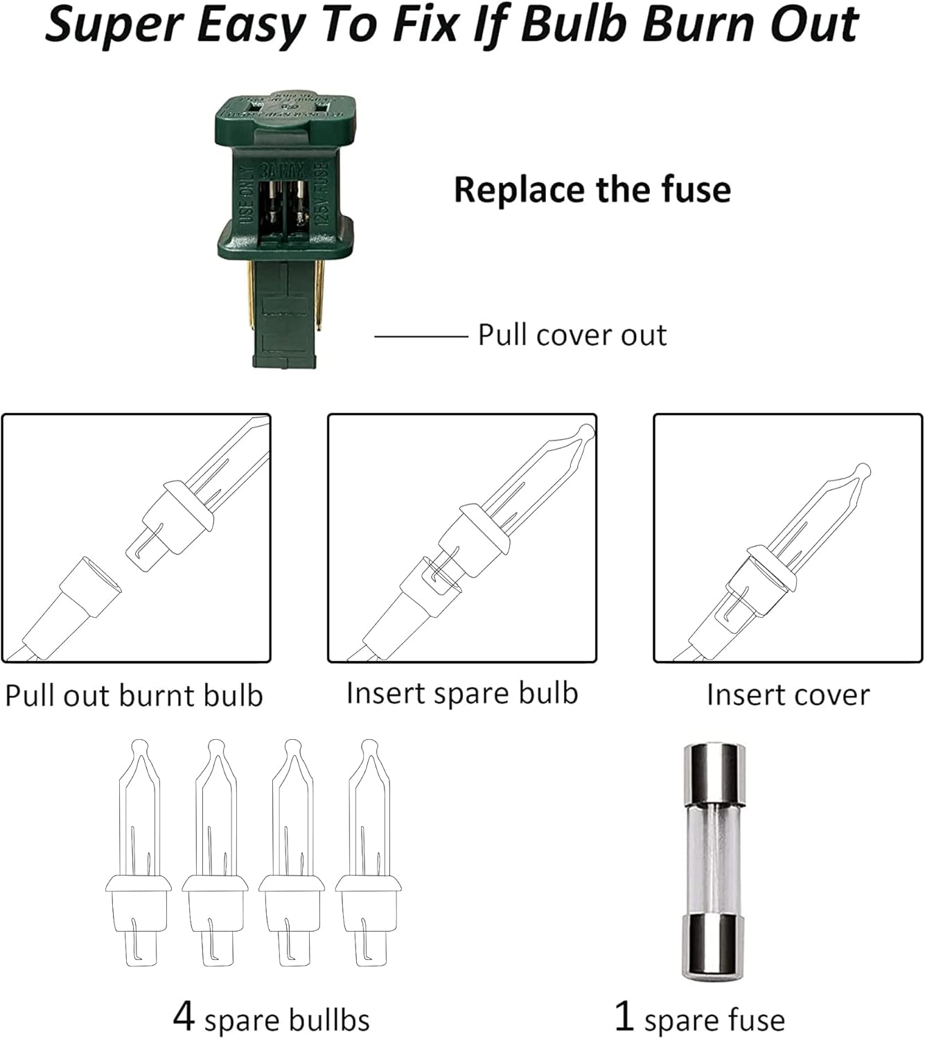 - Lights Size: The Christmas mini string lights includes 100 count incandescent light bulbs, the total length is 20 ft, the length of string light is 18.5 ft, lead wire is 1.5 ft, spacing between each light is 2.25 inches. The string light built-in 3A fuse and it is 120V high voltage with UL Certificated for safety, ensure the safety of you and your family. Package Includes: 1 x 20 ft light string, 1 x spare fuse, 4 x additional incandescent bulbs.