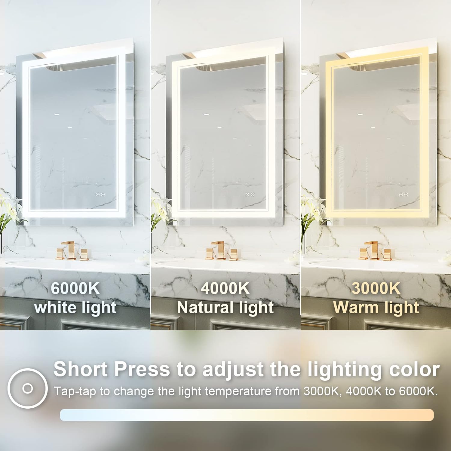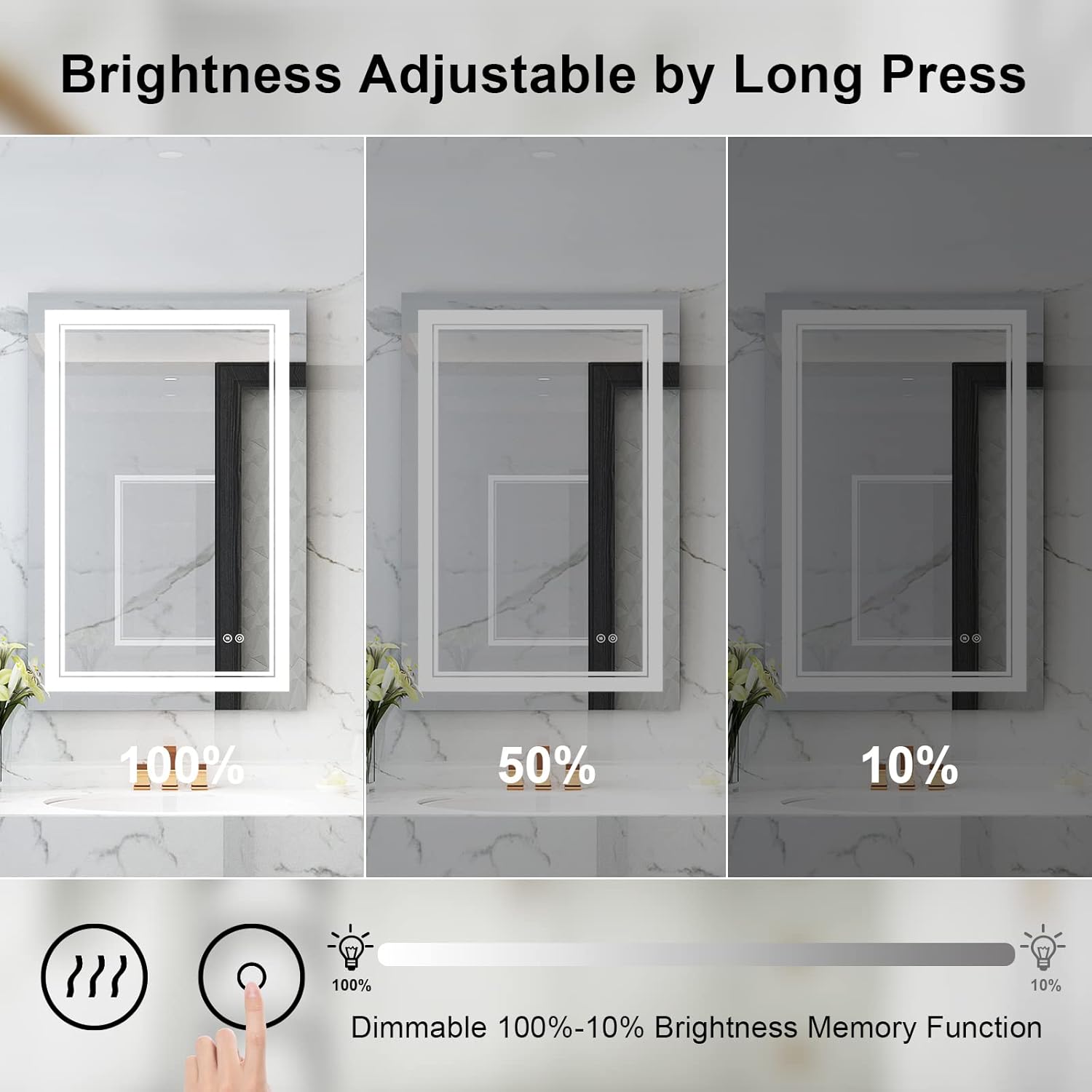 - Dimmable: Our smart vanity mirrors can adjust the color (warm, natural and white) and brightness (100%-10%) of the lights. Not only that, the lighted bathroom mirror also has a memory function. The next time you turn it on, it will keep the light color and brightness that suits you best. Perfect for hotels, high-end salons or bedrooms and bathrooms at home.