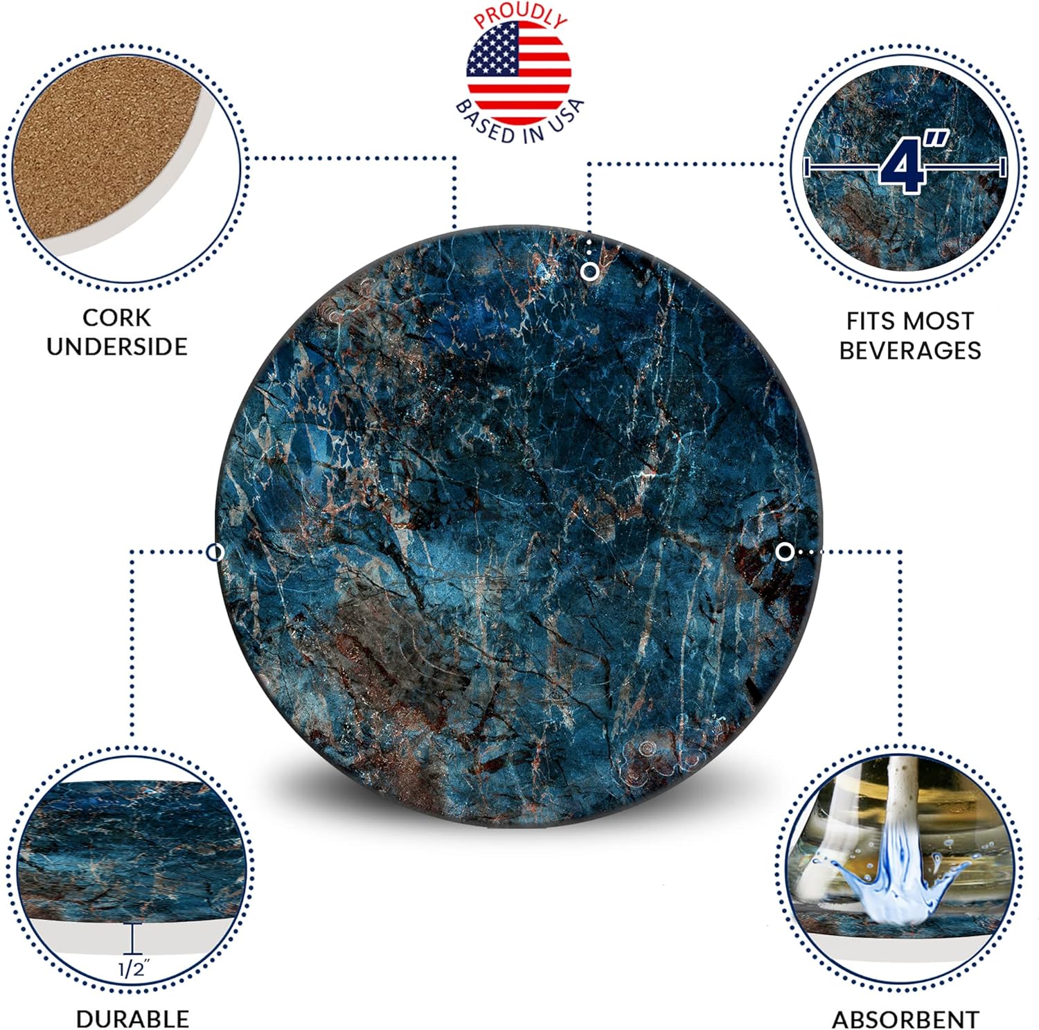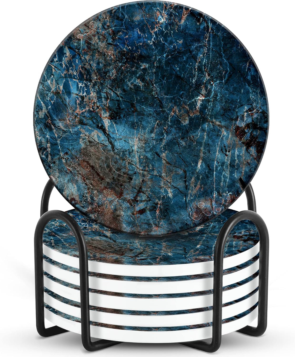 Emerson Coasters for Drinks Absorbent – Natural Stone Drink Coasters Set with Holder, Coasters for Coffee Table, Wooden Tabletop Protection Marble Style – 100% Heavy Duty Set of 6 (Deep Ocean)