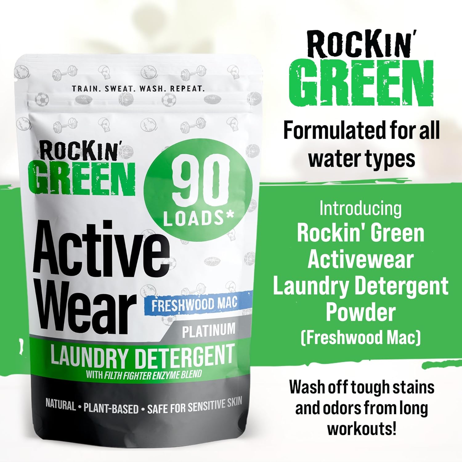 Rockin' Green Laundry Detergent, Plant based, All Natural Laundry Detergent Powder, Vegan and Biodegradable Odor Fighter, Safe for Sensitive Skin (Active Wear 90 Loads - Freshwood Mac)