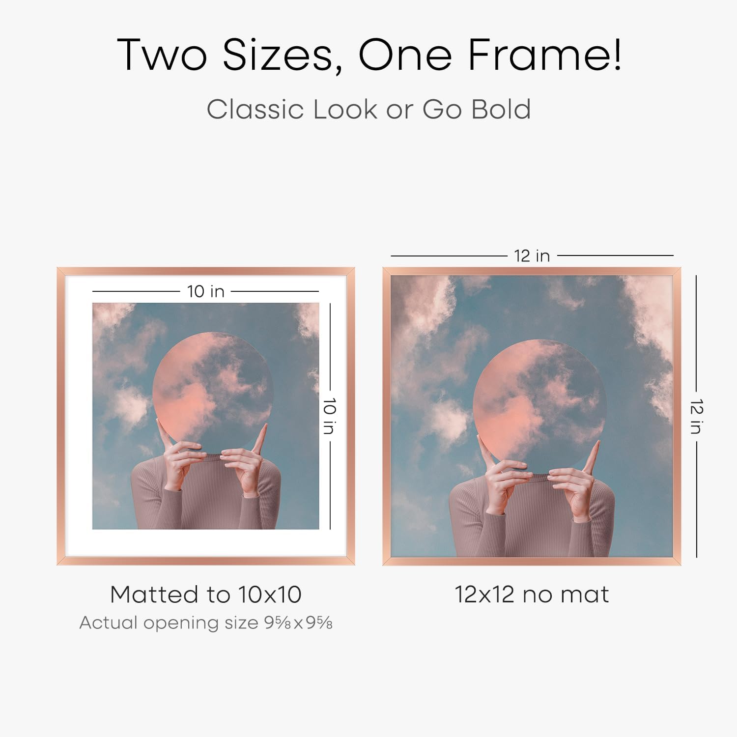 Homeforia 12x12 Picture Frame Rose Gold, High End Metal 12 x 12 Square Poster Frame with Mat 10 x 10 Photo, 12x12 Frame Matted to 10x10 Print, 12by12 Hanging Frames, Tempered Glass, Wall Kit, Set of 1