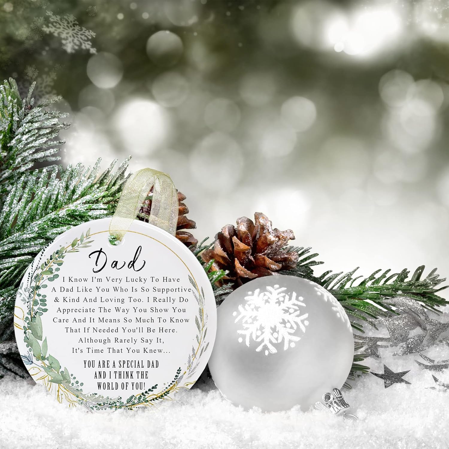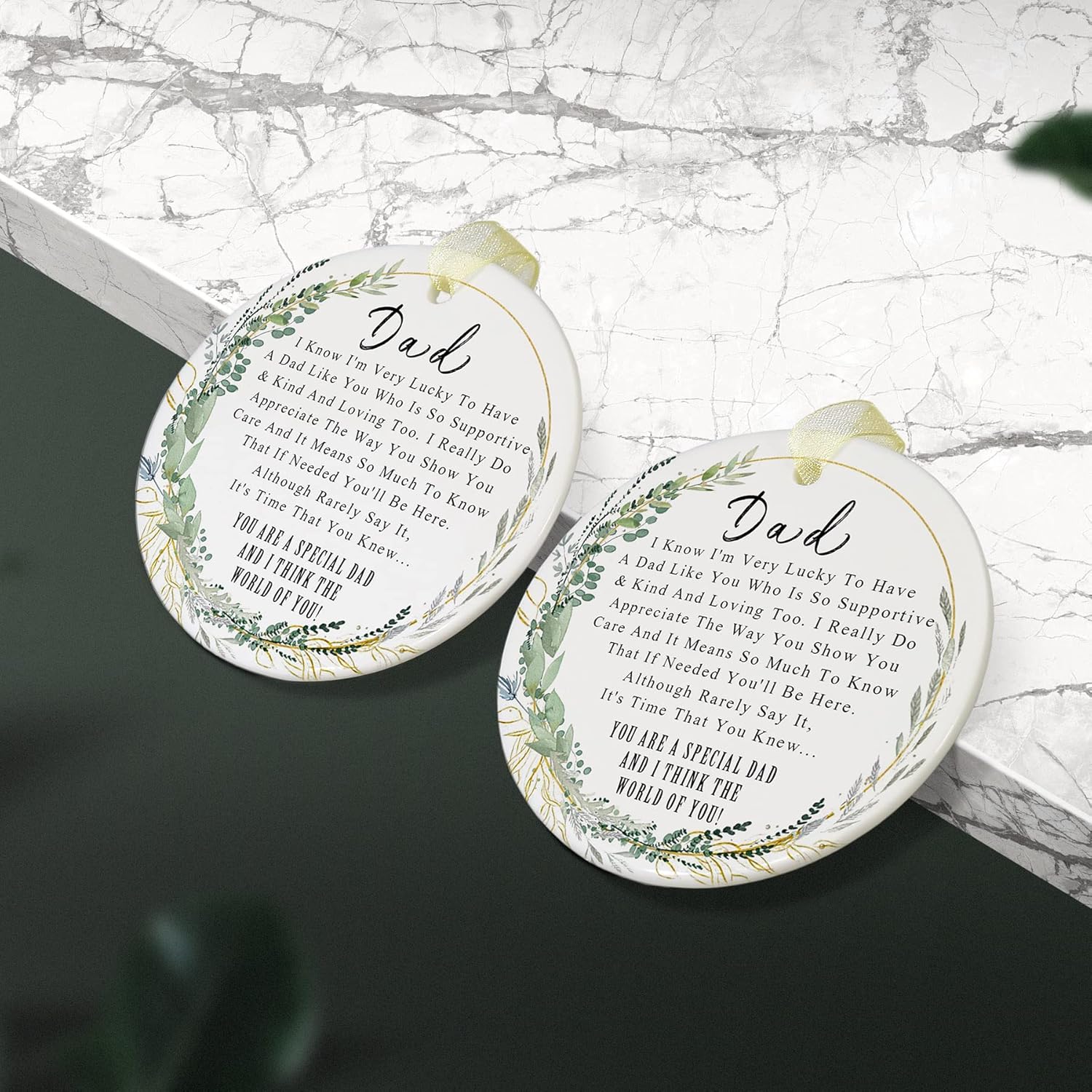 - 🌼【Perfect and delicate size】This is a father memory ornament with a diameter of 2.9 inches and a thickness of only 0.18 inches. The product includes: a round father ornamentt*1, a gift box*1 and a lanyard*1. The gift box comes with it makes it easy for you to give the best dad ever gifts directly to family and friends and other special people in your life, and the lanyard that comes with it helps to hang it easily on the Christmas tree or anywhere you want.
