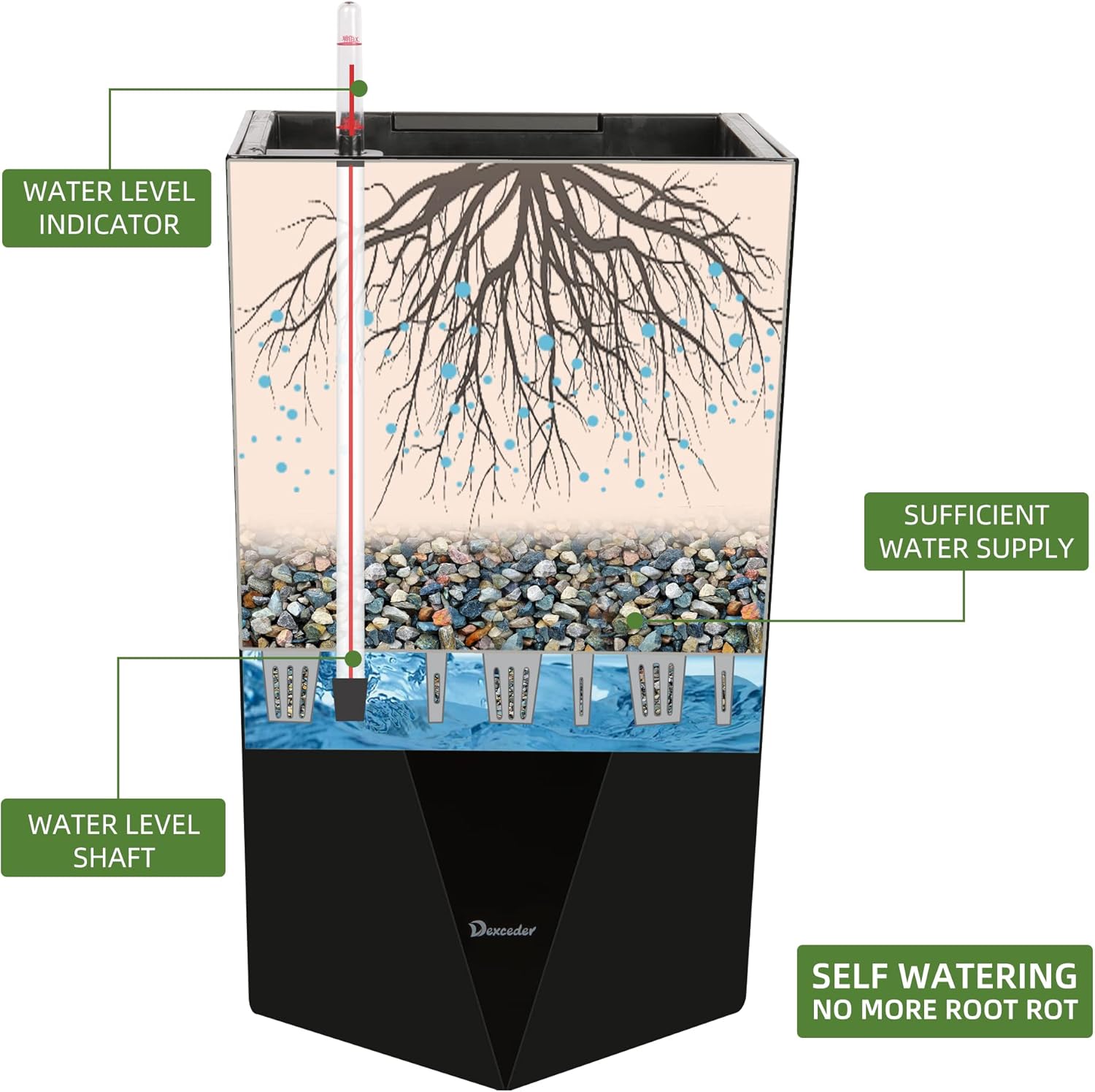 - SELF WATERING & NO MORE ROOT ROT - The smart unique sub-irrigation system is one of the most appealing aspects among all Dexceder planters. The easy-to-use separated integrated water reservoir or catcher- keeps your soil well aerated and automatic supplies plants with the right amount of ongoing moist air & nutrition for optimal growth. The insert indicator shows you the exact time to water again. The full water supply period can single-handedly last over 1 month based on different live plants