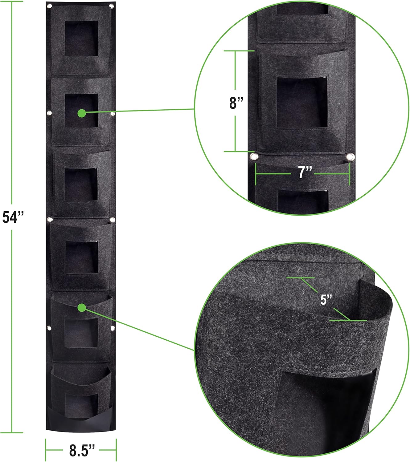- [Deep Vertical Garden Planter Pockets] - Built with Felt Fabric material, the 6 spacious, strong pockets each measure 7" L x 5" W x 8" H. The strong, liquid-absorbing fabric combined with the heavy-duty grommets make each pocket formidable and supportive for soil, water, plants, fruits, vegetables and more. Comes with 1 hanging planter. The full grow bag measures 8.5" L x 5.5" W x 54" H and acts as a living wall.