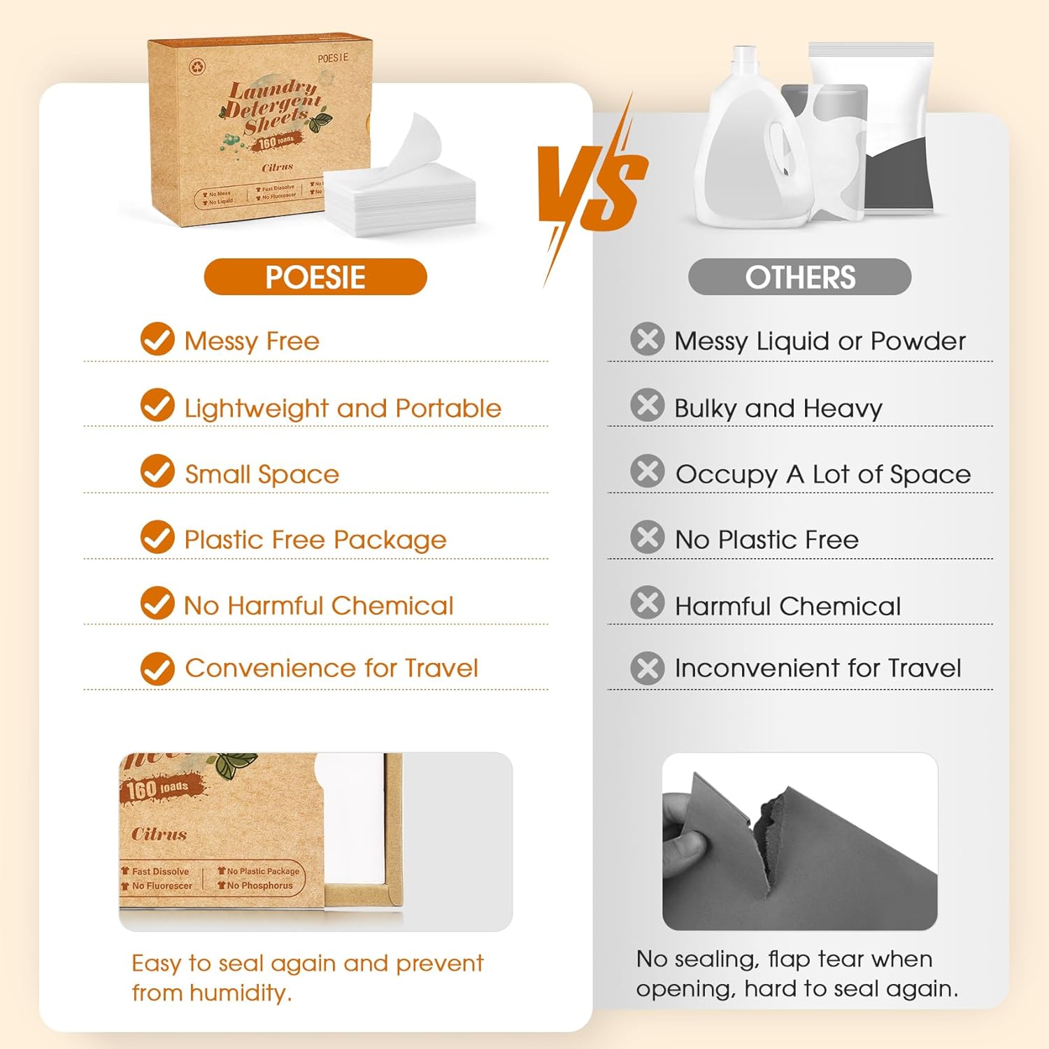 Poesie Laundry Detergent Sheets Citrus Scent 160 Sheets 80 Large Loads Laundry Strips No Plastic Jug Liquidless Travel Portable HE for Camping Dorm Life Clean