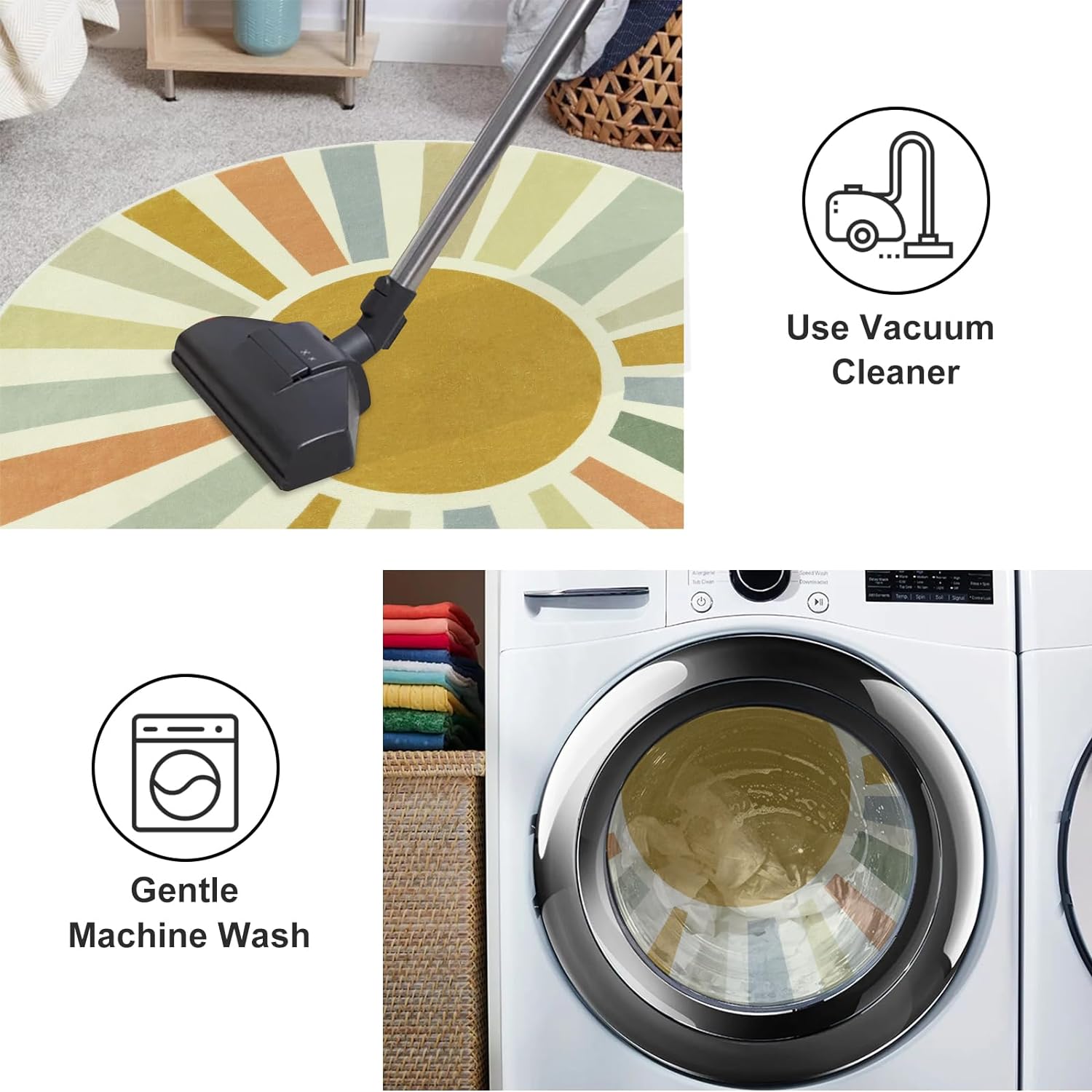 - Machine Washable:Gentle cycle wash in cold water is recommended,it can be tumbled in a dryer using the air-only cycle with no heat.Use a vacuum cleaner for daily cleaning.Use laundry bag to make the circular rug more sturdy.