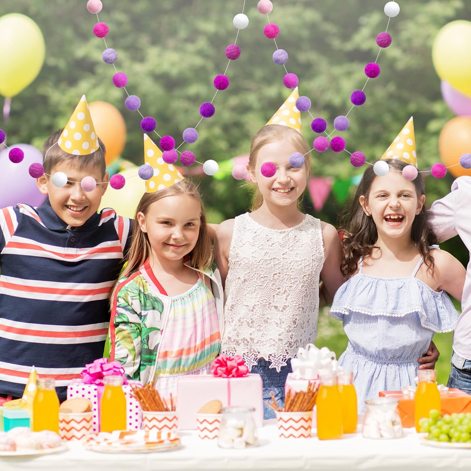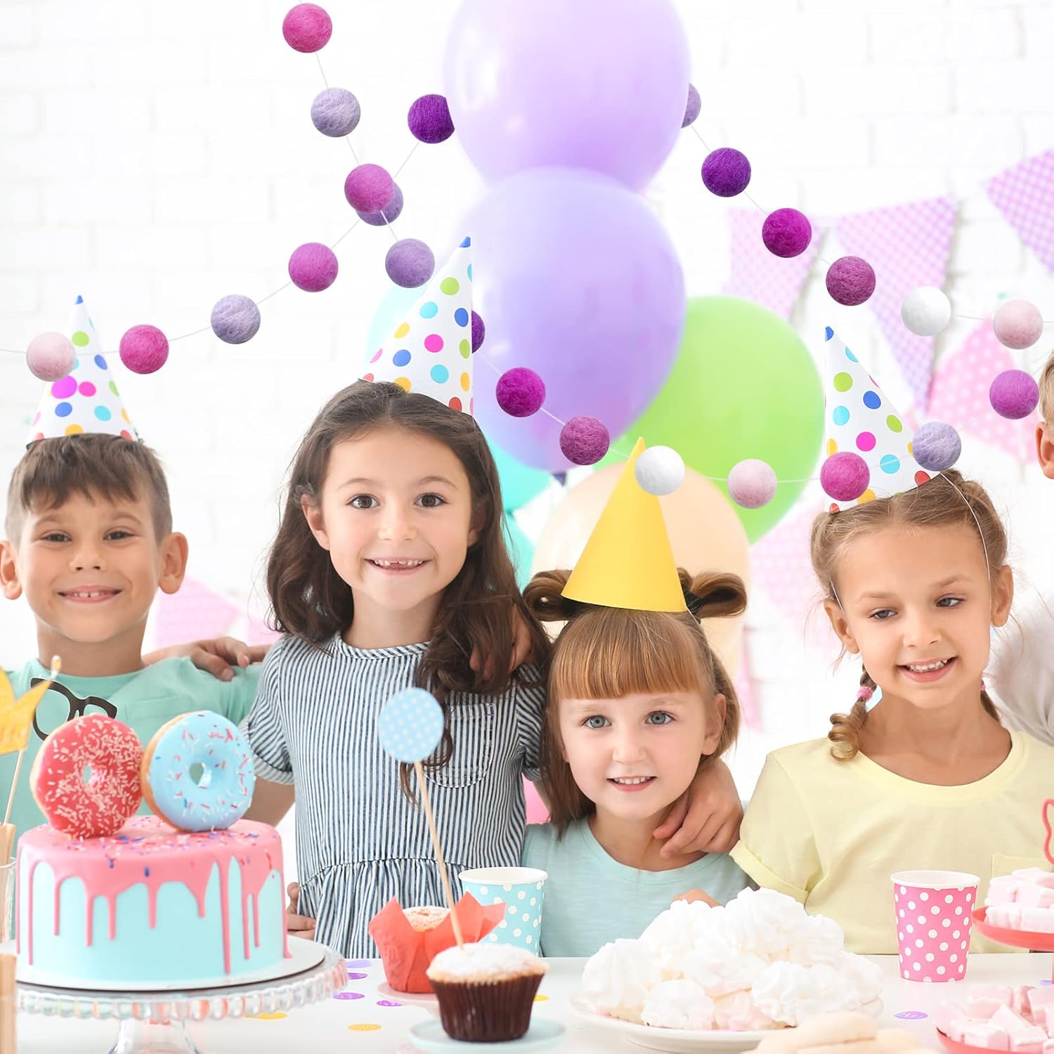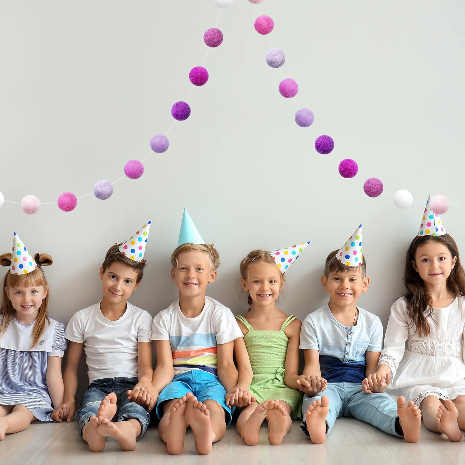 - Pom Pom Garland: This garland is made with 20mm felt balls. 36 balls are hand-stitched to the string. ▶▶Balls are NOT in fixed position in the garland.