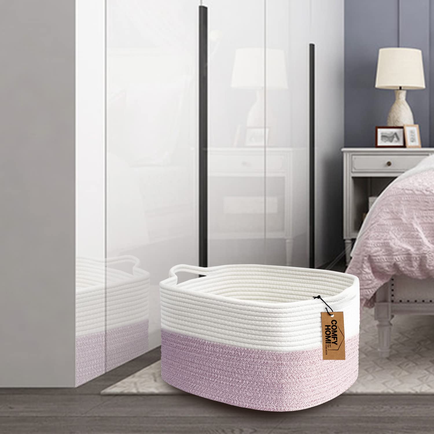 COMFY-HOMI Cotton Rope Woven Medium Basket with Handles for shelf,Cloth Storage Basket for Organizing-13.5X11X9.5 Storage Bin for Bedroom, Newborn or Infant Gift for boy girl (White/Pink)