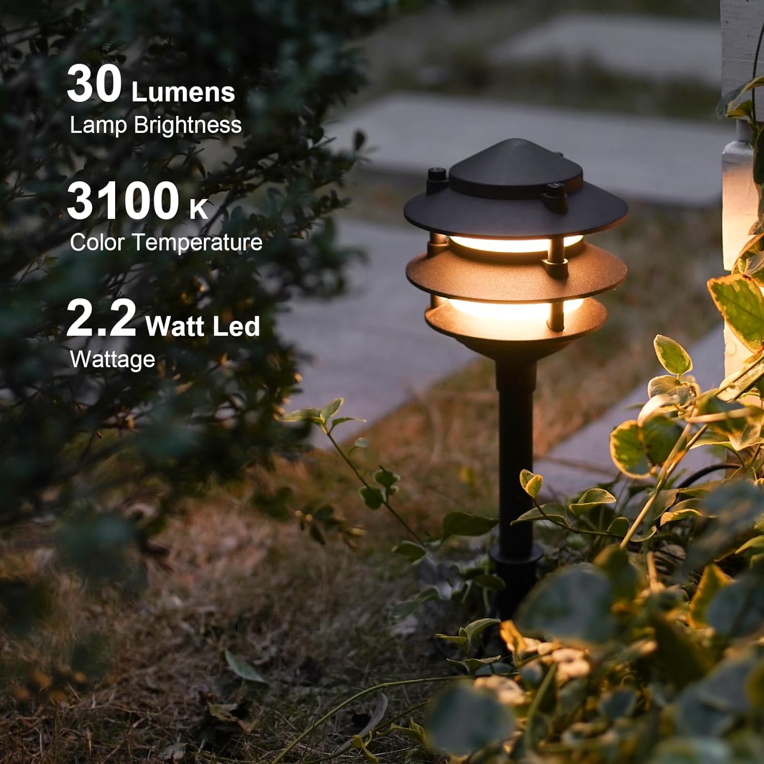 - ✔8PK 12V AC PATHWAY LIGHTS: These 8PK low voltage path lights are 2.2 watt led with 30 lumen warm white. You will like the 3 tier pagoda shape, a refreshing option from other shaped landscape lights