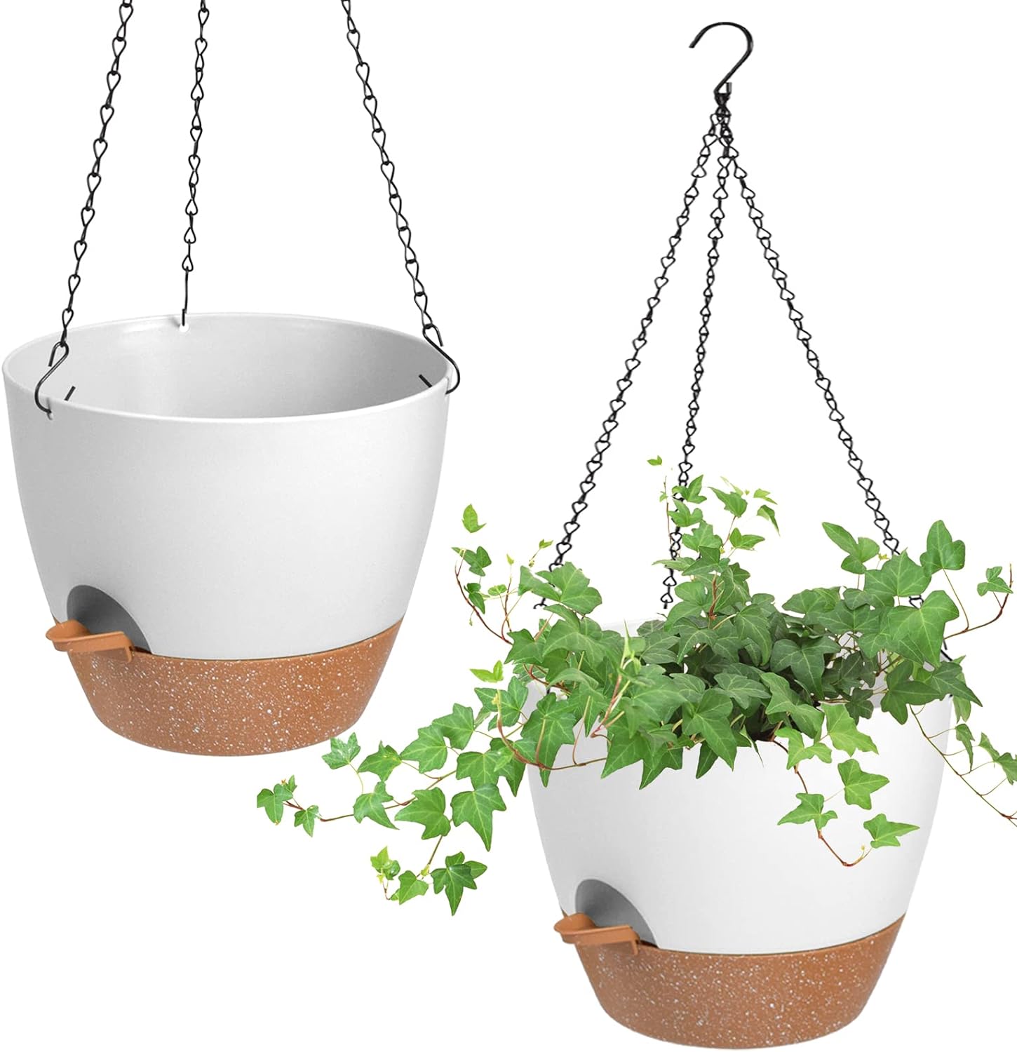 Hanging Planters for Indoor Outdoor Plants, 2 Pack Self Watering Hanging Pot with Drainage Holes & Removable Tray (White, 10'')
