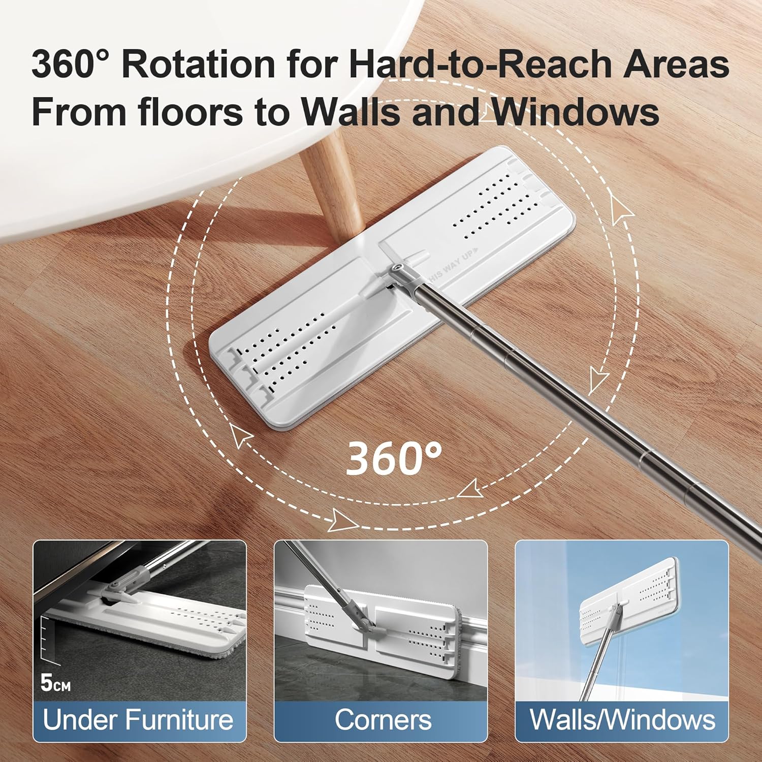 - [Two Extended Microfiber Mops] Family Choice! With 360°rotation and bigger mop head, it can reach to any corners, those "under-the-whatever" and more wider places for much faster cleaning job! The 2 adjustable Stainless Steel Handles can be extended from 26.5 to 60.0 inches, great for wet dry mops or dust mops for wall cleaning