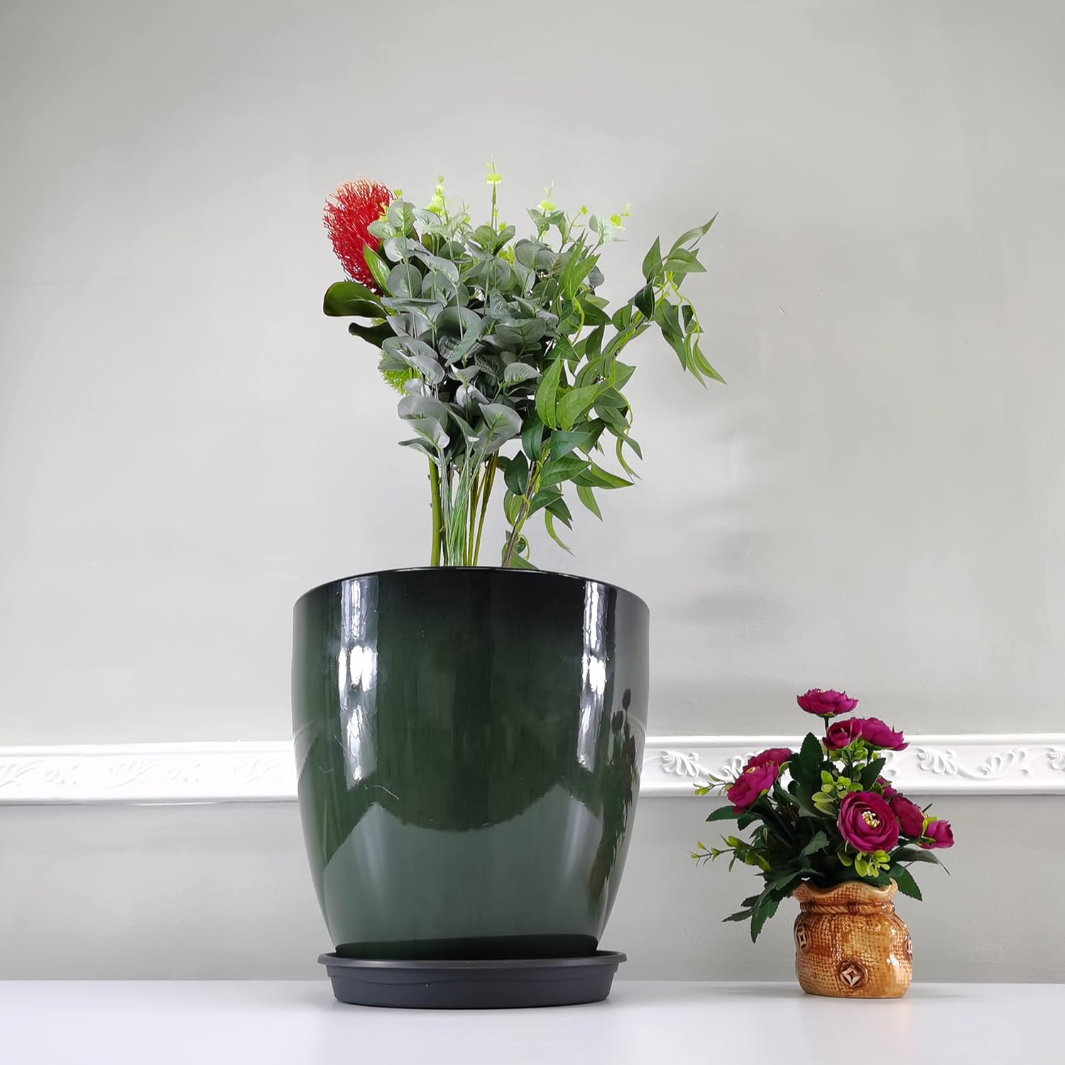 FixtureDisplays® Garden Green Plastic Round 11.8 Inches Diameter 11.8 Inches Tall Planter Resin Glazed Faux Ceramic Flower Pots Drainage Hole with Saucer Decorative Pot 15675-NF