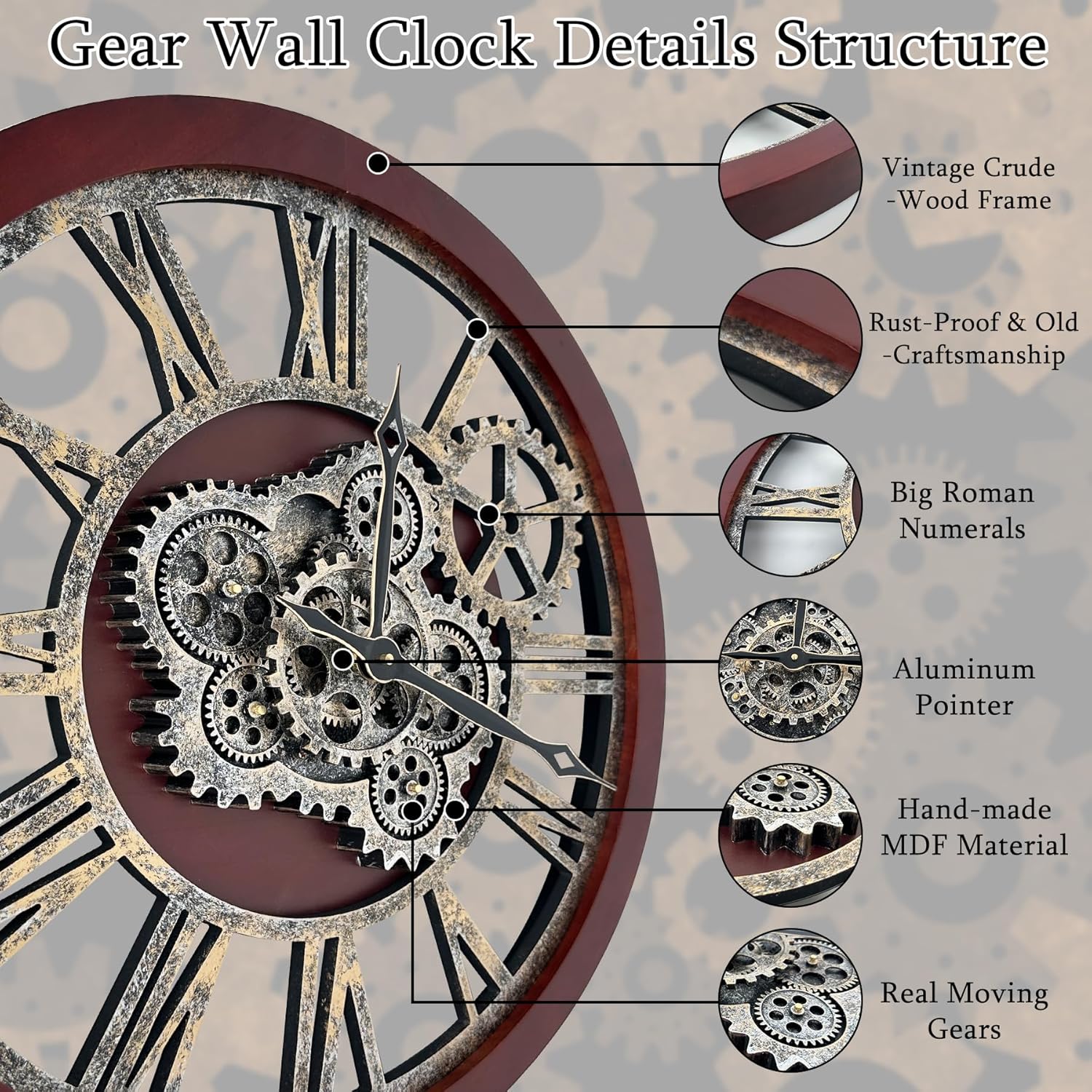 - 【Real Moving Gear Clock】All gears for the wall clock are real moving! Design with rustic bronze-color and industrial style. An creative combination of four gears for a retro look, has a very exquisite decorative effect makes the wall clock become a chic art works. The large wall clock crafted of nature wood & MDF. Big roman numeral numbers and wood rustic moving gears perfect for any room decor.