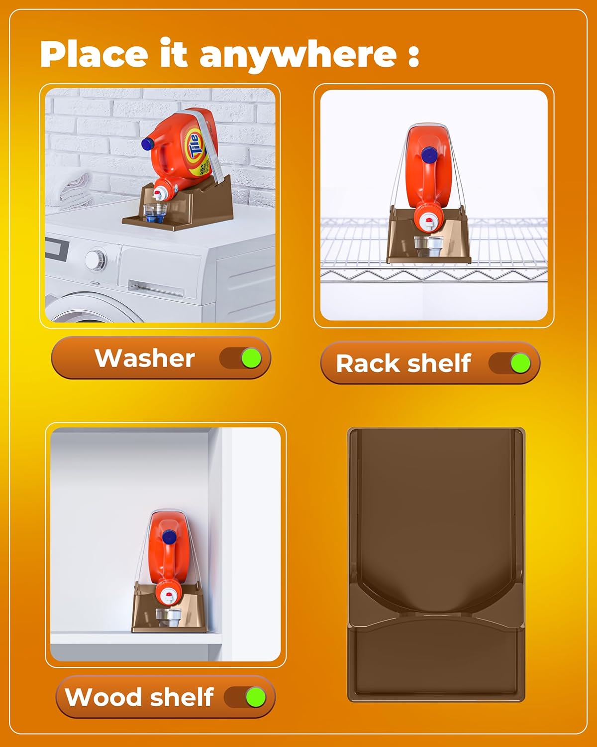 - [Mess-Free Measuring:] The molded edge of this detergent holder for laundry room ensures your measuring cup stays in place, preventing drips and keeping your laundry space clean and organized.