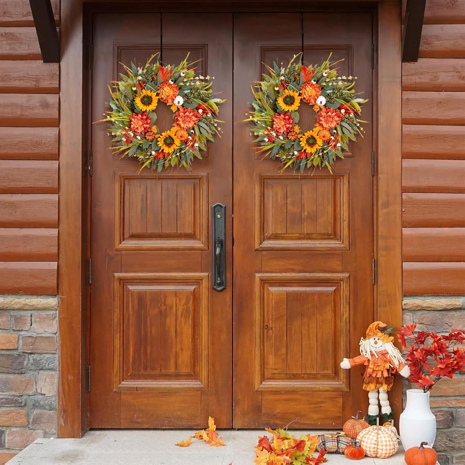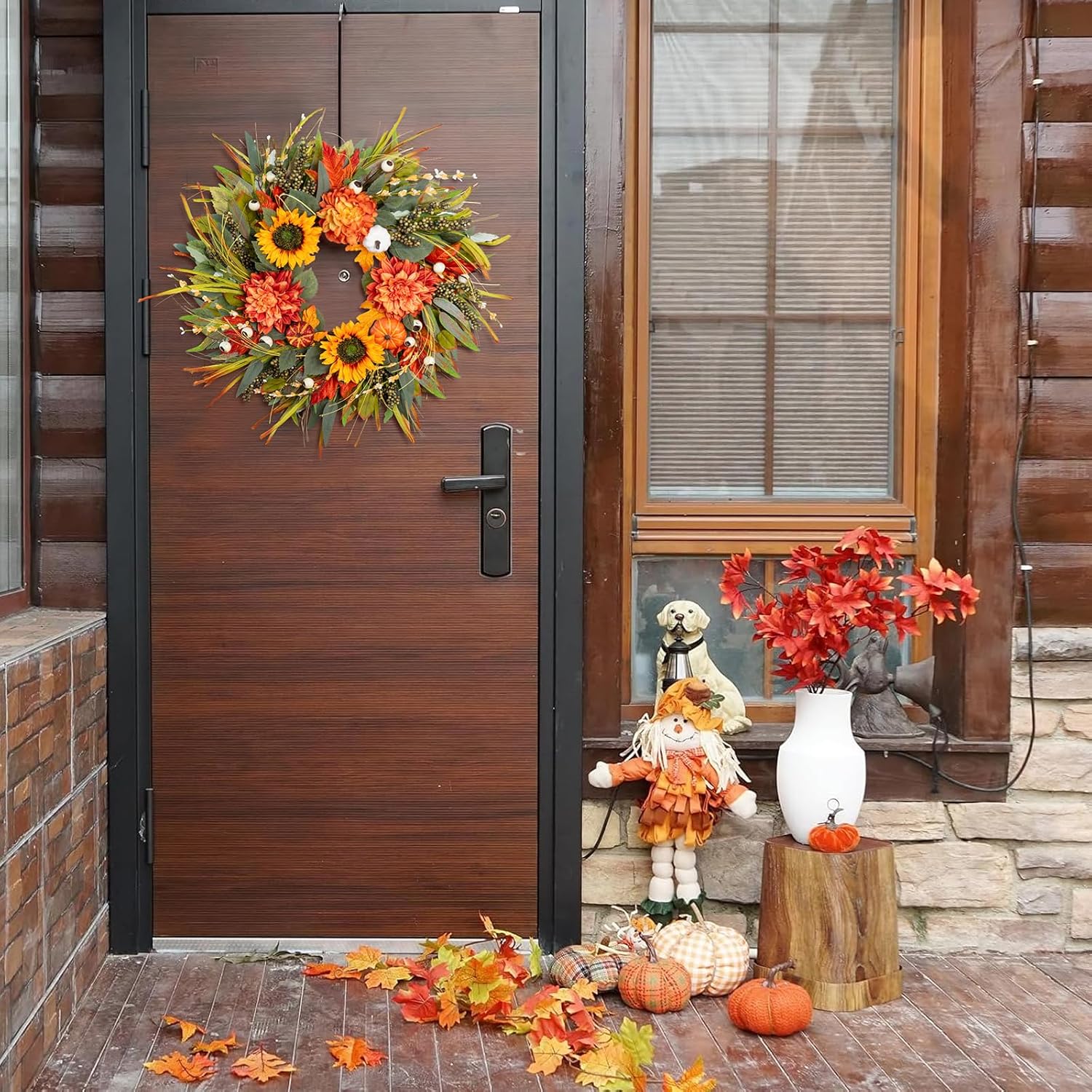- A Full Celebration of Fall at Your Doorstep Bring autumn's charm right to your entryway with this handcrafted fall wreath — a gorgeous blend of pumpkins, sunflowers, berries, and vibrant leaves. Each element is thoughtfully placed to evoke the warmth of a crisp October morning or a cozy Thanksgiving afternoon.