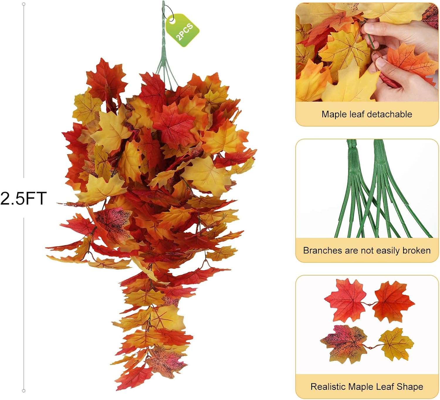 - [Perfect Outdoor Fall Fake Pplants]Hanging maple leaves plants are the perfect decoration for autumn and Thanksgiving day,the fall maple leaf garlands can create a festival atmosphere for you home.Artificial hanging maple leaves plants can be applied to indoor and outdoor autumn decorations.