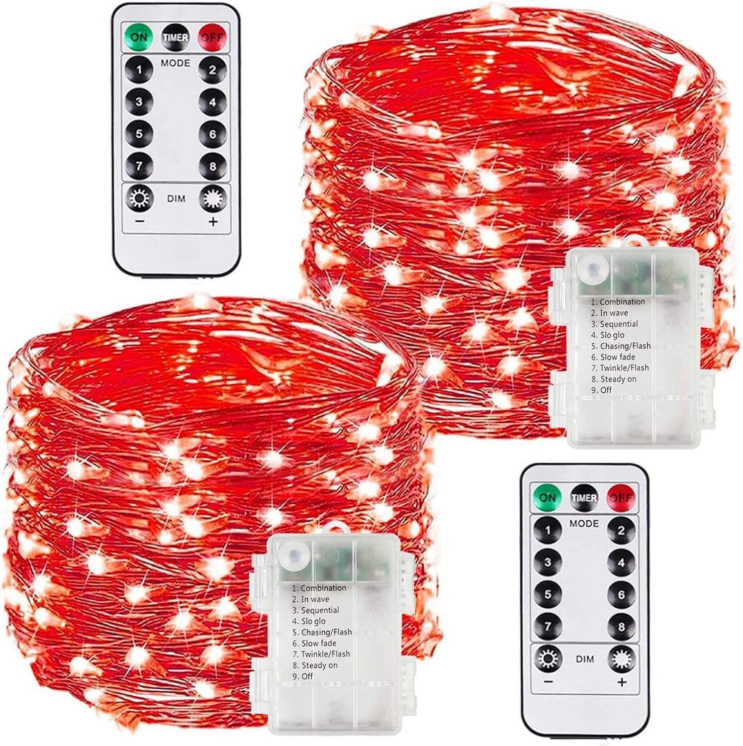 2 Pack 100LED Battery Operated Fairy Lights with Remote, 8 Modes LED String Lights with Timer, Dimmable, Memory Function, Waterproof Twinkle Lights for Outdoor Indoor Christmas Decor(Red)