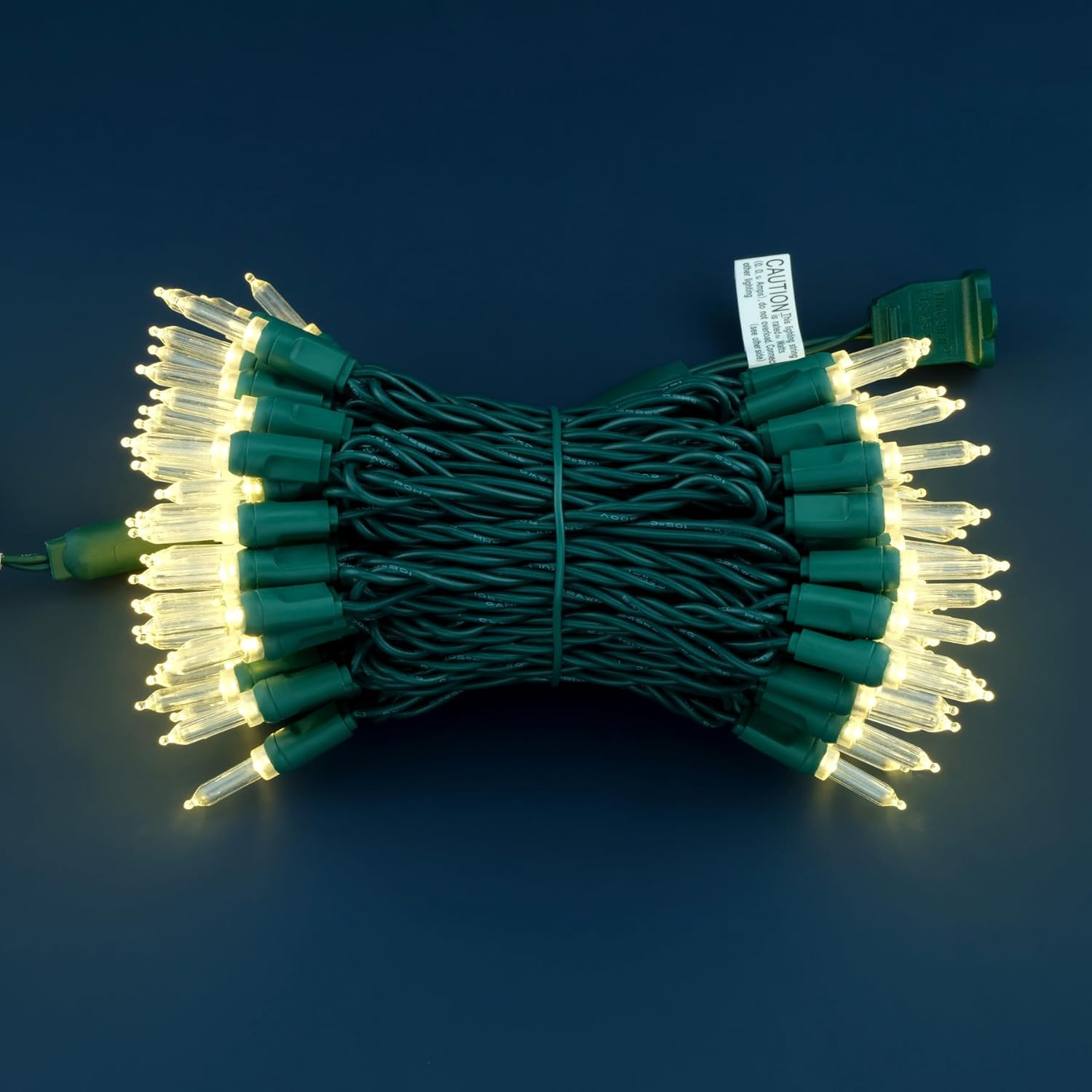 - SPECIFICATIONS โ Each pack contains 1 strands of one-piece string lights, total length 33 feet with 100 count warm white mini lights. 22 AWG green cord, 4" lead, 4" spacing, 4" tail.