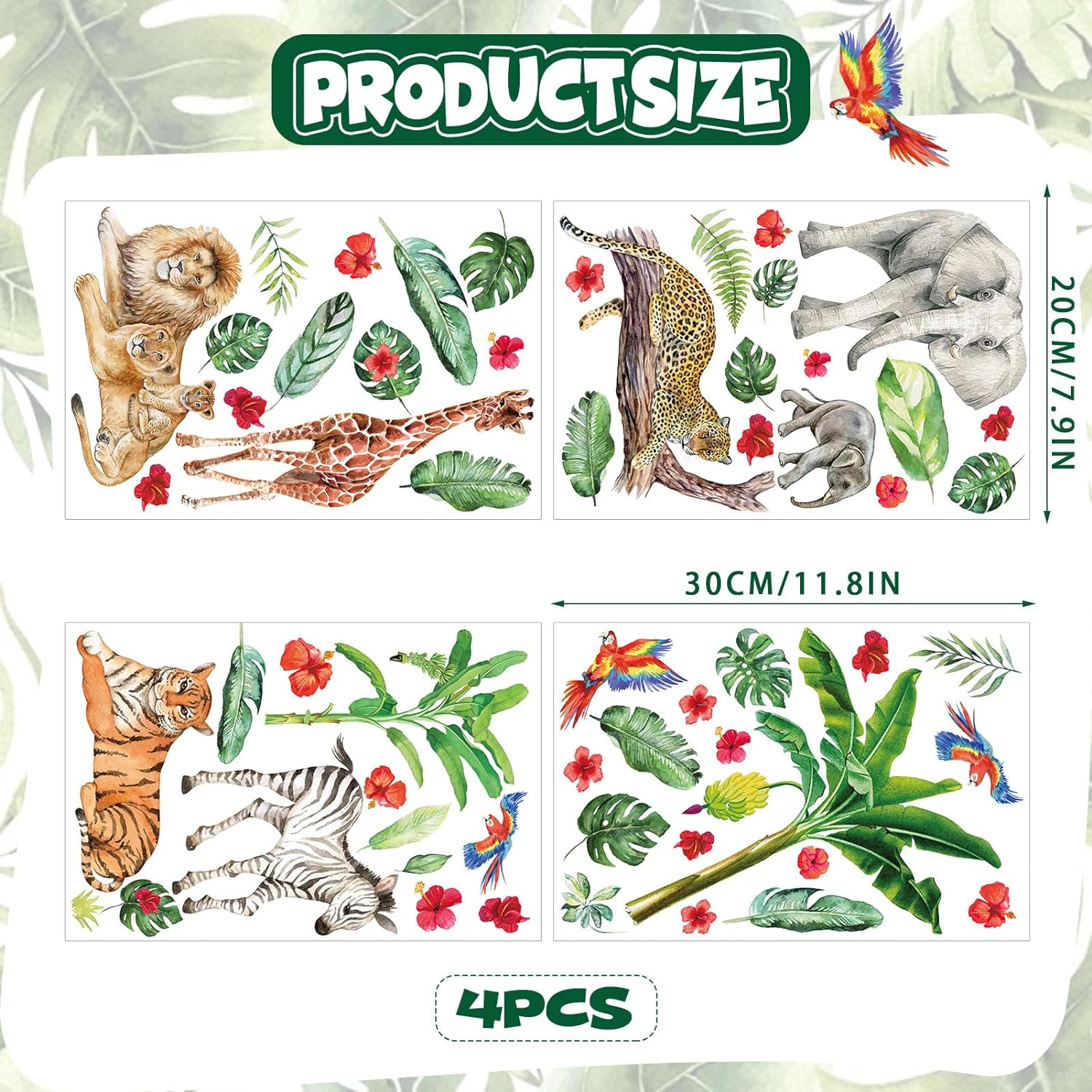 - GLOW SAFARI ANIMALS WALL DECALS:You will get 4 piece of luminous jungle animals wall decals in a set,including coconut tree,tiger,elephant,lion, giraffe,zebra, tropical plants and flowers patterns,which can turn your kid's room into a vivid and realistic animals world.