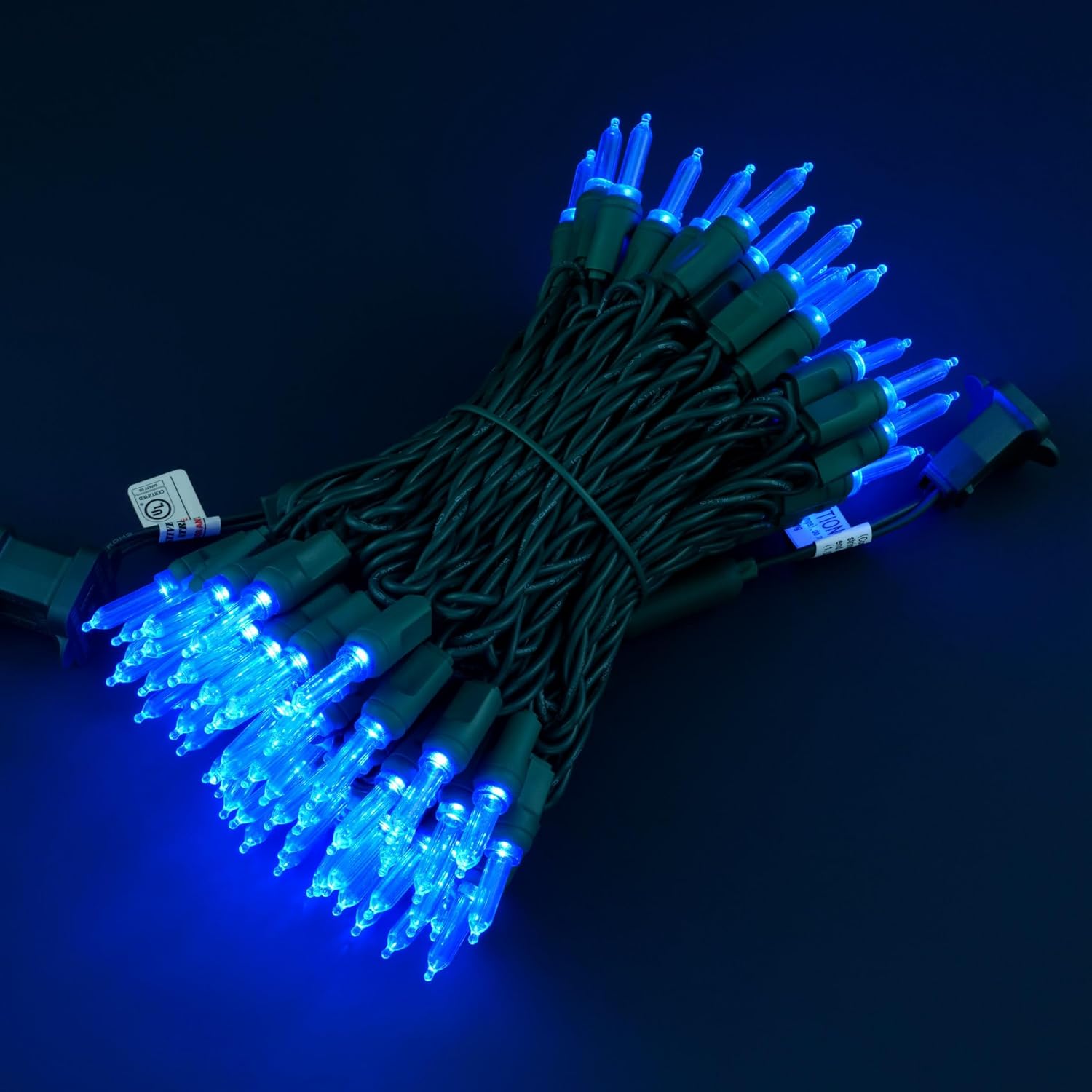 - SPECIFICATIONS โ Each pack contains 1 strands of one-piece string lights, total length 33 feet with 100 count blue mini lights. 22 AWG green cord, 4" lead, 4" spacing, 4" tail.
