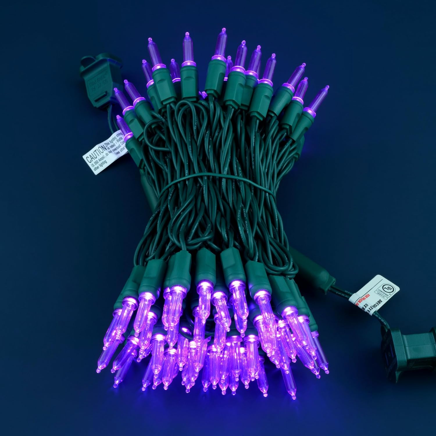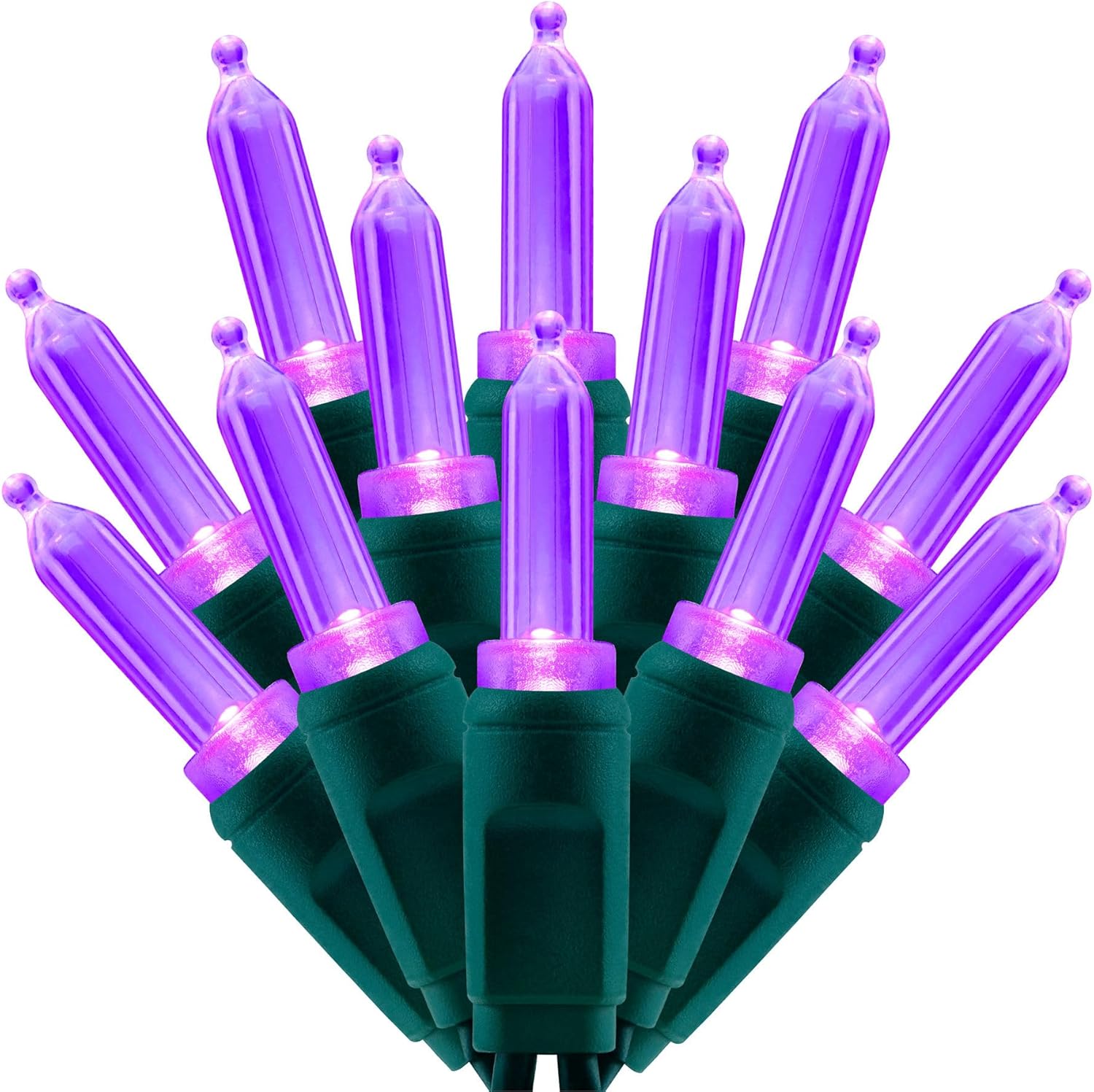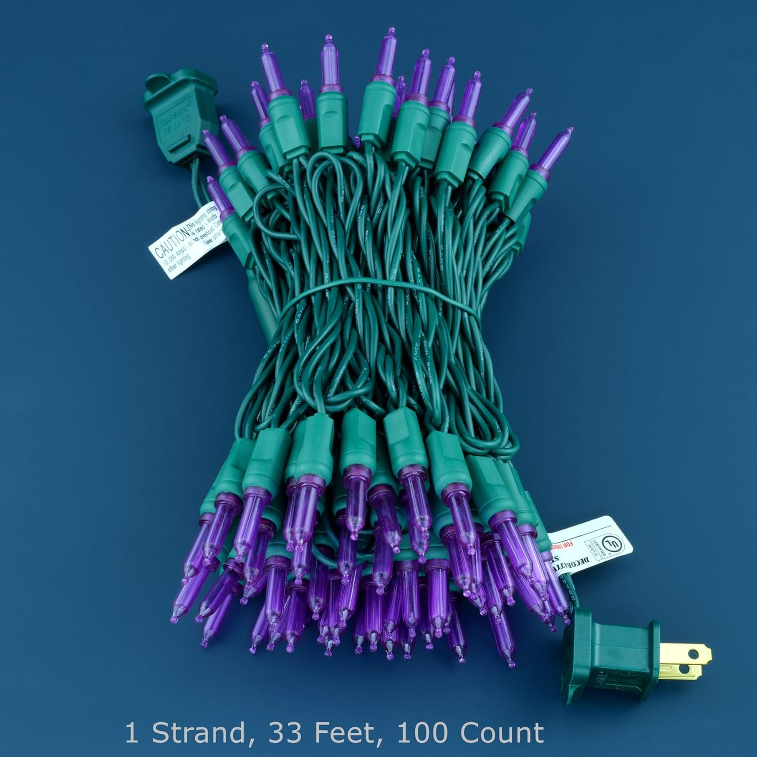 - SPECIFICATIONS โ Each pack contains 1 strands of one-piece string lights, total length 33 feet with 100 count purple mini lights. 22 AWG green cord, 4" lead, 4" spacing, 4" tail.