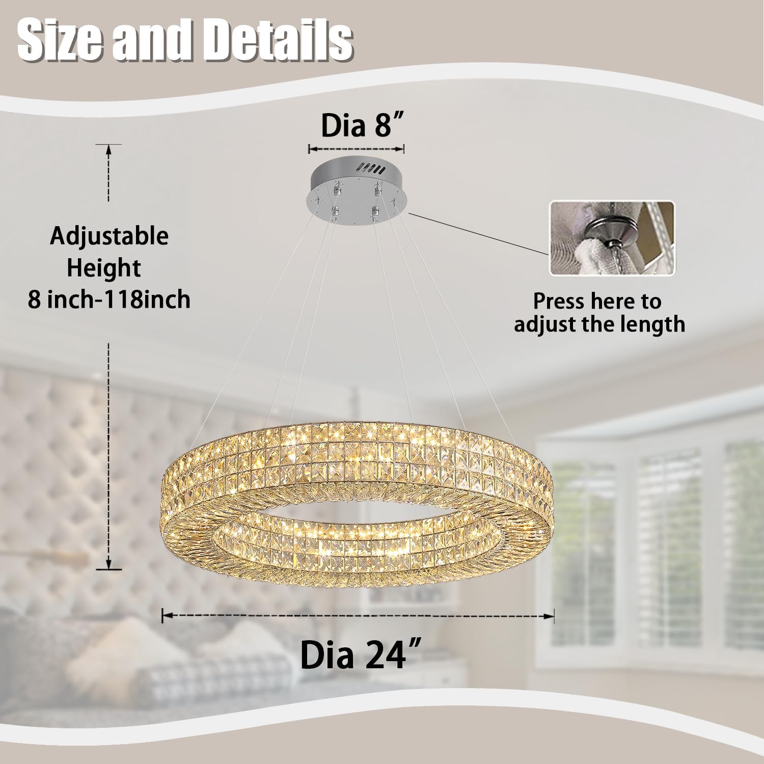 - 【Modern LED Crystal Chandelier】:D24"*H118".Pendant cord is adjustable.Shortest Adjustable Height is 20"