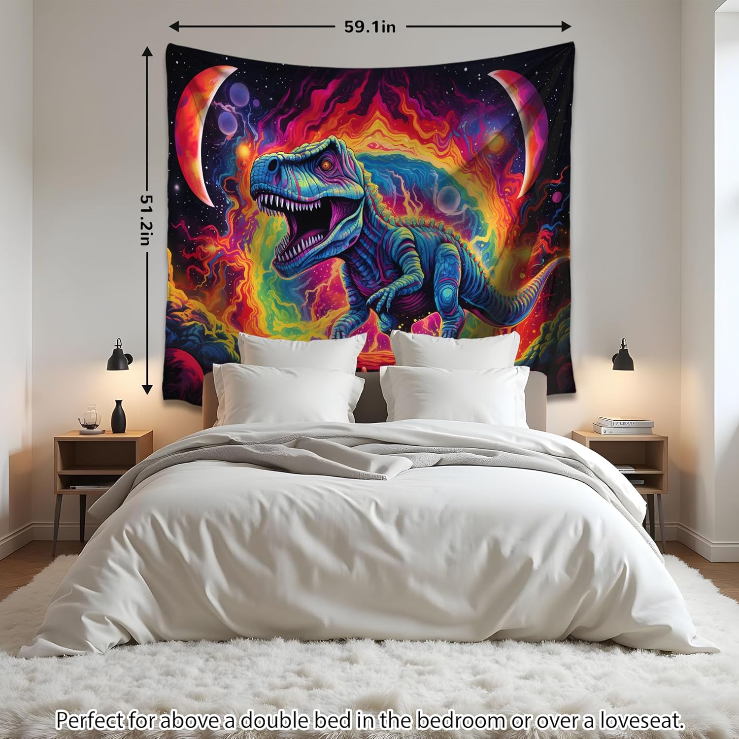 - MATERIALS AND SIZES: 100% Polyester. Blacklight tapestry dinosaur has a variety of sizes, please note - Photos shown in sample settings are not completely dimensional to their surroundings. Please double check sizes above to insure your satisfaction