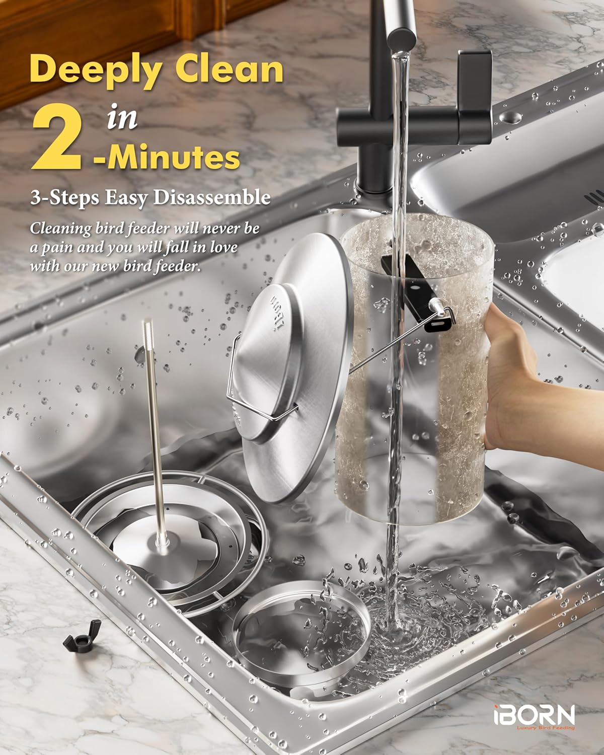 - 【3-Steps Disassemble,Easy Clean Thoroughly】All pieces can be disassembled for through cleaning;3-steps disassemble finish in minute,no screwing and no tool.Keeping bird feed fresh and healthy. Cleaning bird feeder will never be a pain and you will fall in love with our new bird feeder.
