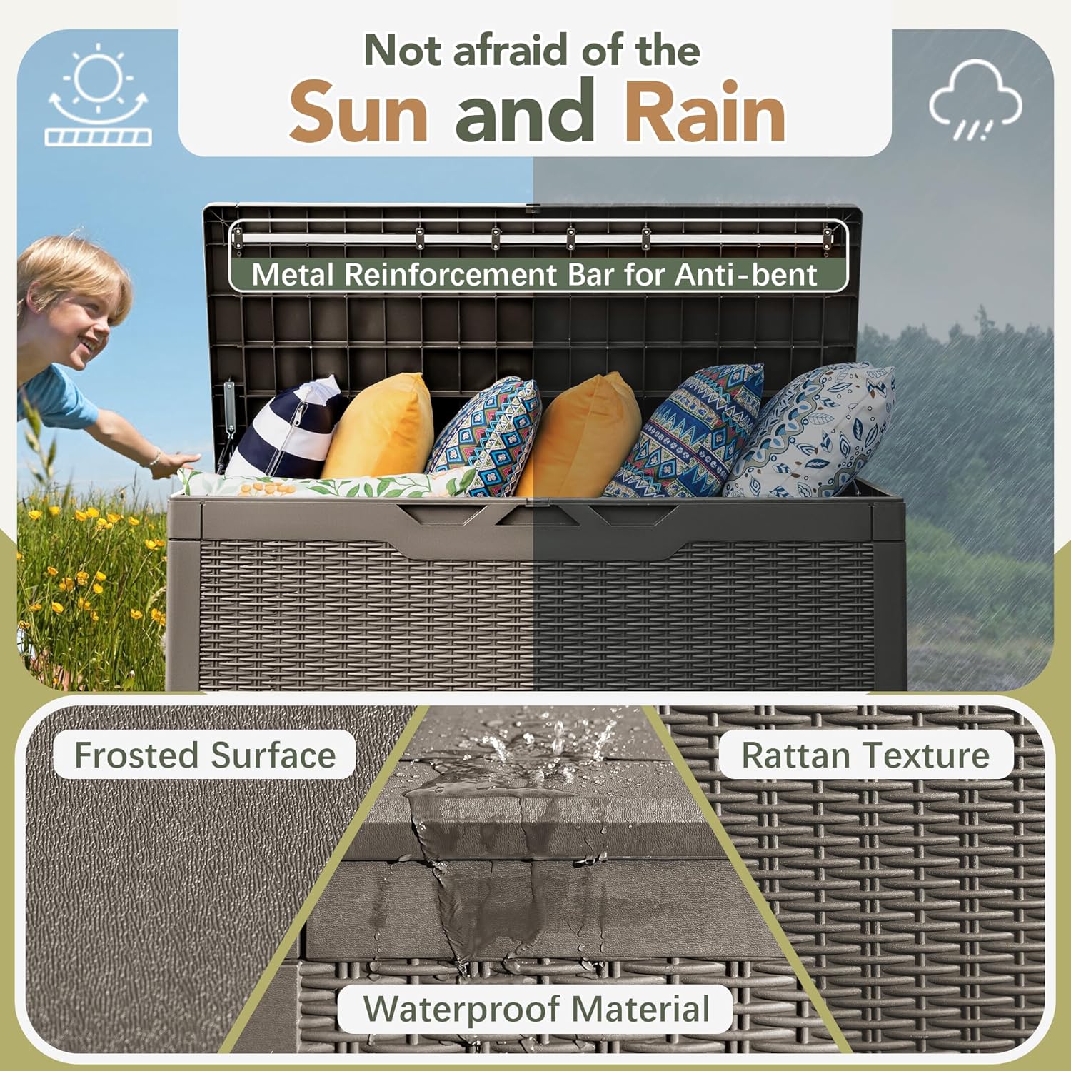 - [All-Weather Material] Deck box is made of premium Resin, featured with waterproof and UV resistant which protects its exterior from fading and keeps its interior dry. Suitable for long time outdoor using