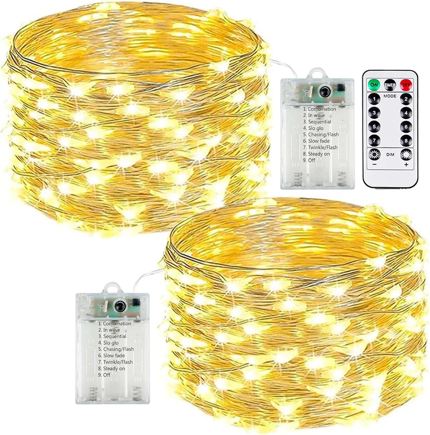 2-Pack 50 LED Fairy Lights Battery Operated with Remote Control Timer, 16 FT 50 LED Battery Lights Outdoor Indoor, 8 Mode Twinkle String Lights for Classroom Party Bedroom Christmas Décor (Warm White)