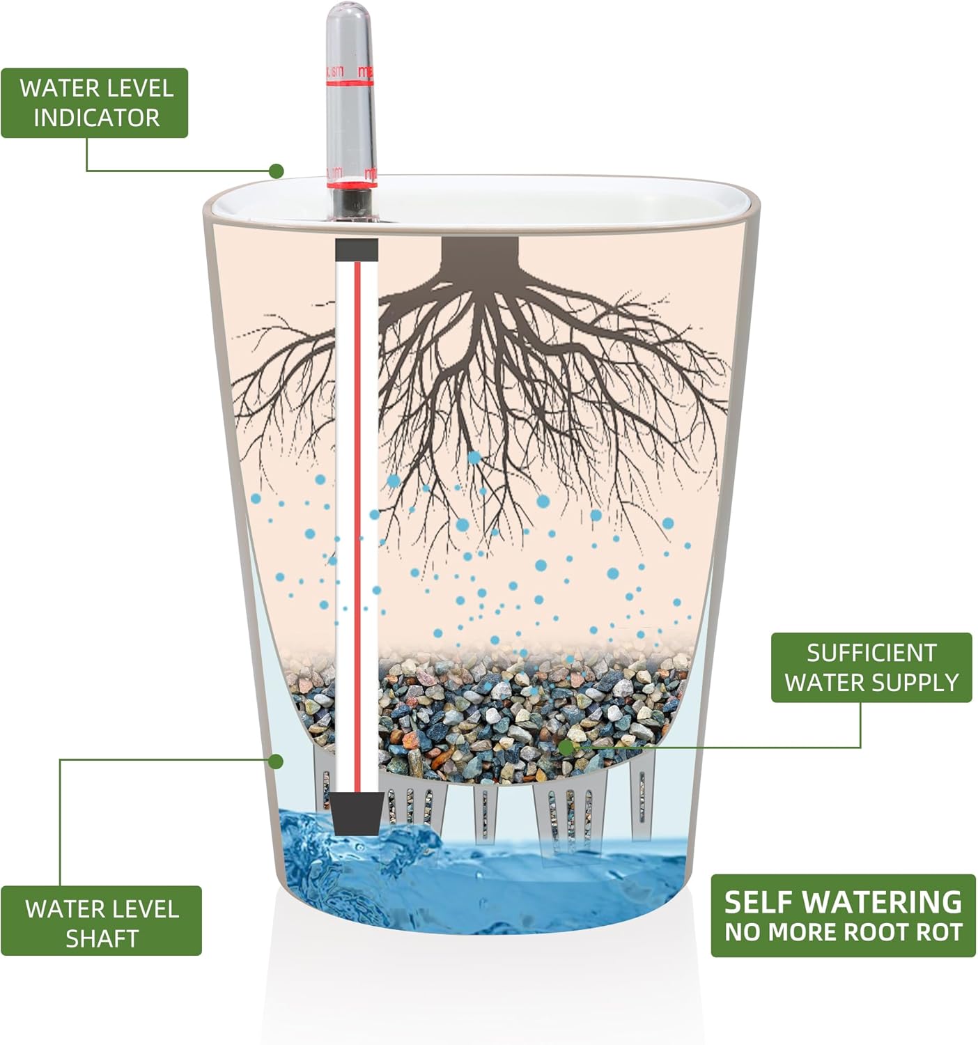 - NEVER MISS WATERING AGAIN - The hydroponic device keeps water ready, then watering time is at your discretion on the gauge. The design of drainage plug and spillway hole is to avoid cycles of overwatering and underwatering, pull out the plug to drain the excess water on rainy days outdoors. The sufficient water supply system enables double the water-efficient than conventional pots. Don't be anxious about missing watering while you enjoy a long term holiday on a journey or travel outside