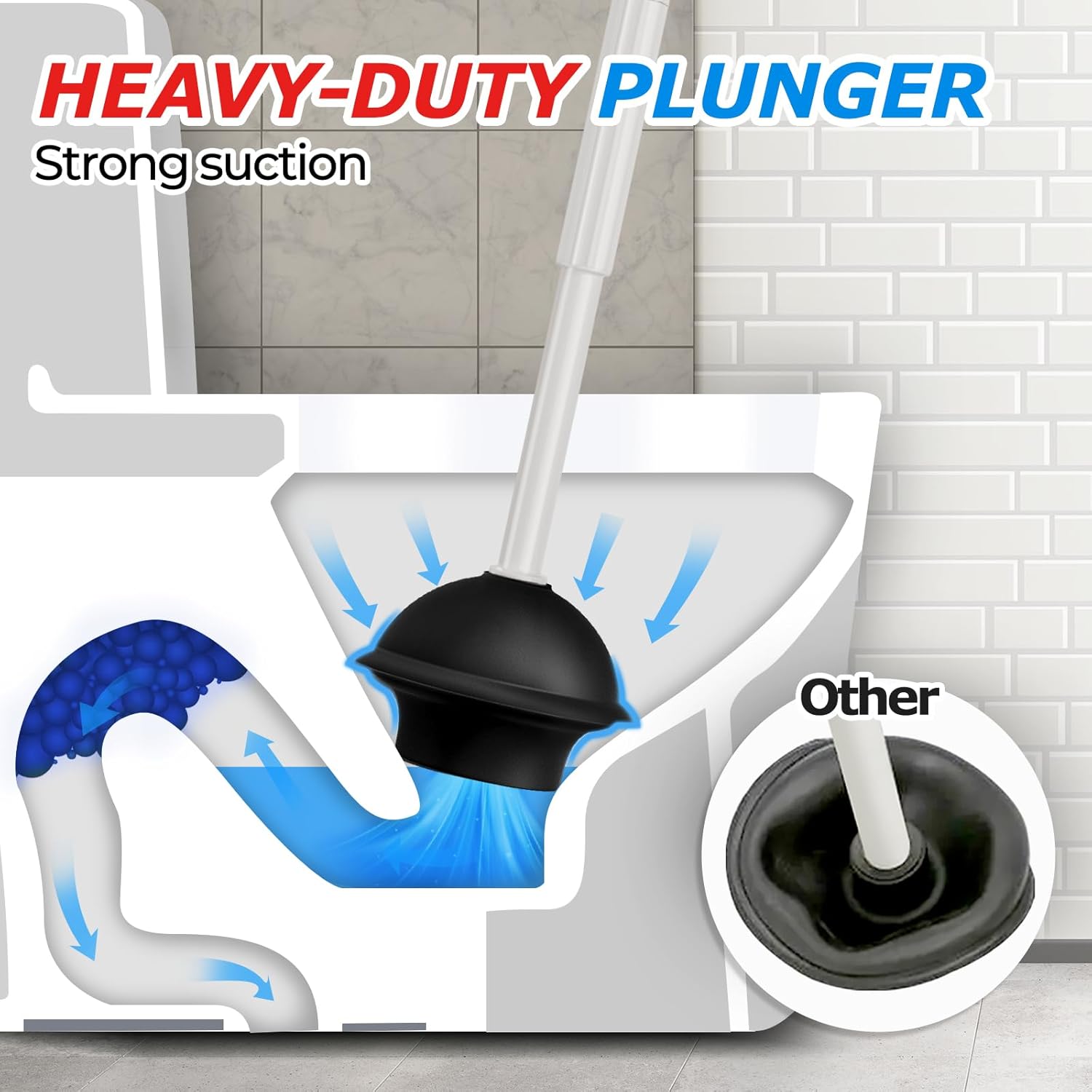 - Extended handle -Heavy Duty Toilet Plunger: Compared to ordinary handles, our upgraded extended handle provides a better user experience and prevents stains from splashing onto the hands.A professional powerful suction cup that can solve various blockage problems. Comfortable handles provide greater support during use.