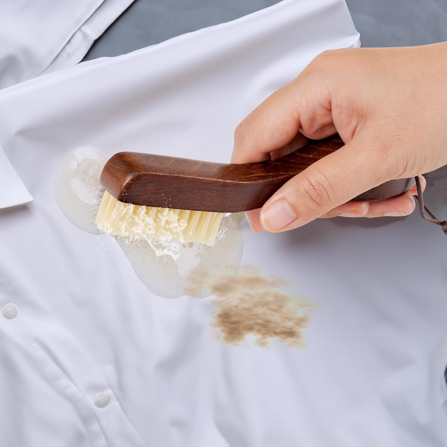 - Soft White Boar Bristles: The boar bristles on this laundry stain brush are relatively stiffer compared to horsehair, making it excellent for removing spots and scrubbing out stains from various fabrics, including cotton, denim, velvet, polyester, nylon, and more. Unlike a stiff toothbrush, the soft white boar bristles won't damage or pill fabrics.