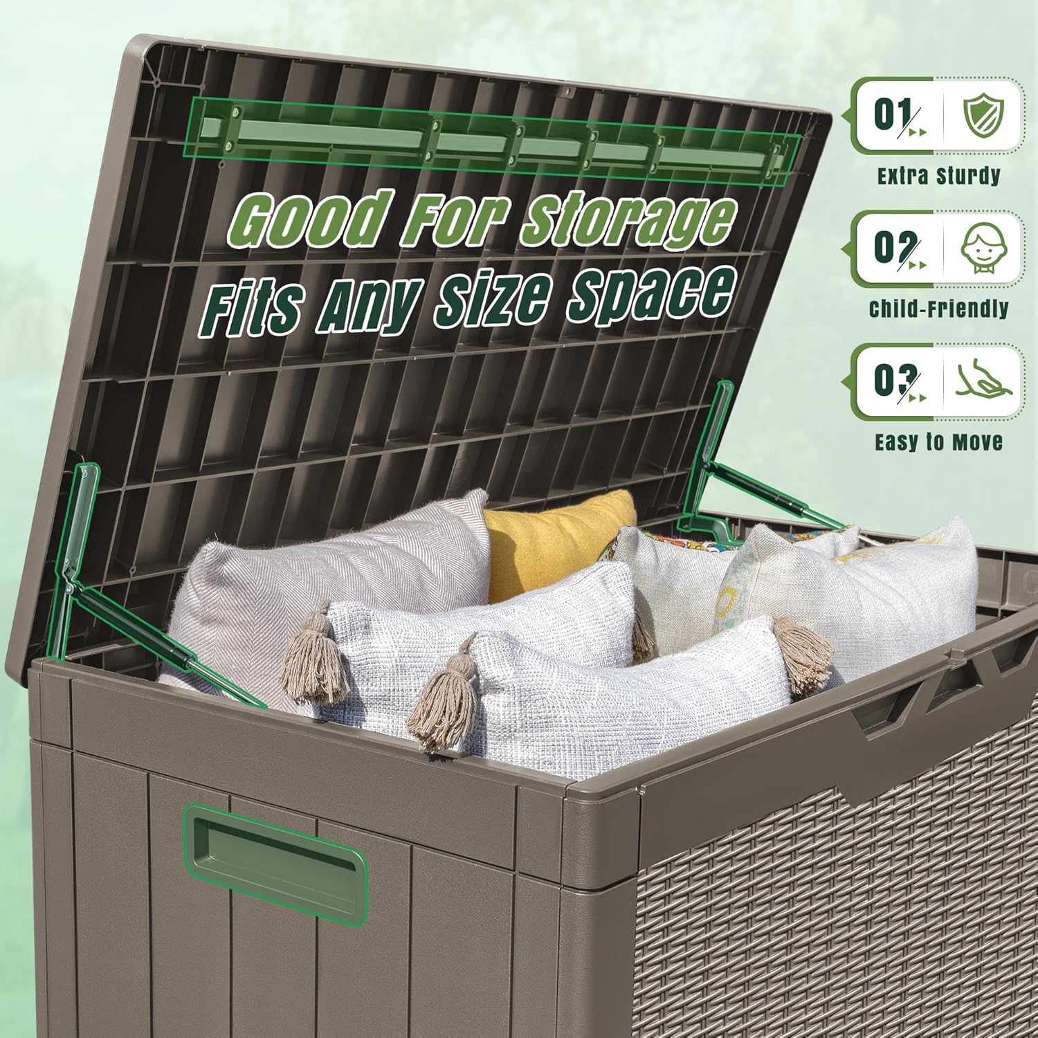 Greesum 100 Gallon Resin Deck Box Large Outdoor Storage with Cushions for Patio Furniture, Garden Tools, Pool Supplies, Weatherproof and UV Resistant, Lockable, Light Coffee