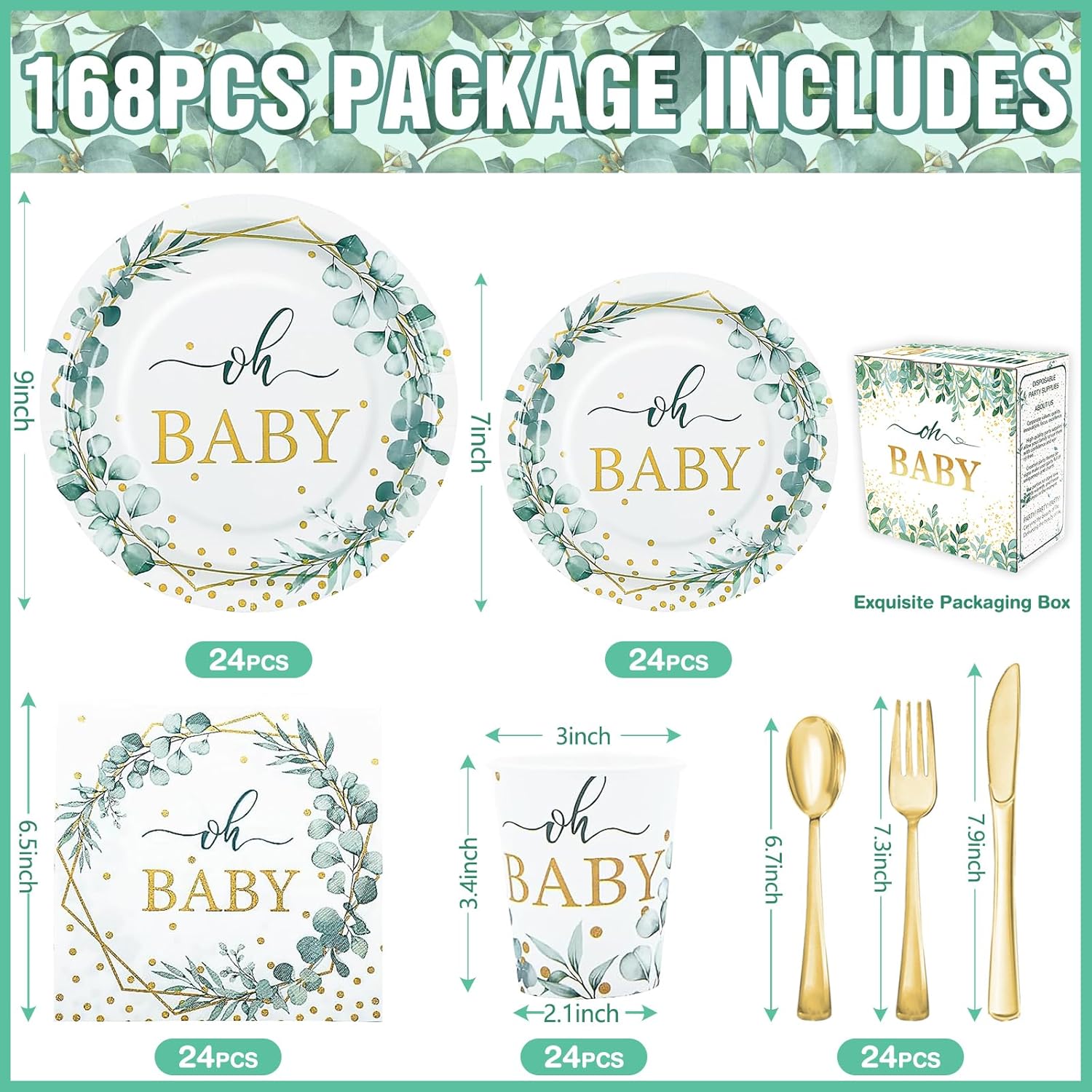 168 PCS Sage Green Baby Shower Decorations Neutral, Baby Shower Plates and Cups and Napkins Sets Serves 24, Oh Baby Plates for Boy, Gender Reveal, Green and Gold Plant Eucalyptus Boho